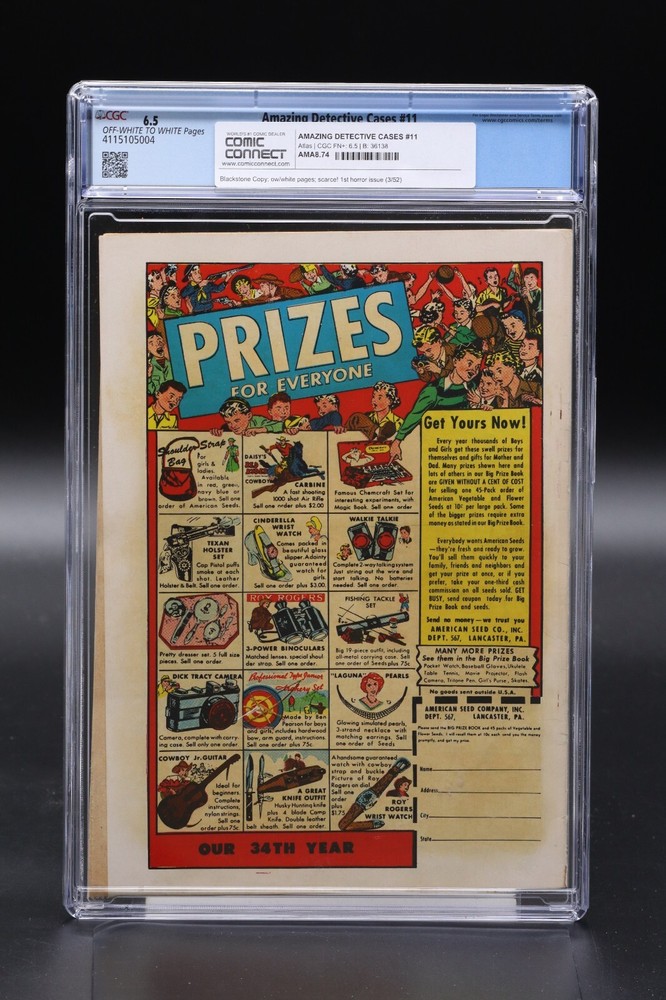Link to our BEST items!! Link to our ENDING items!! Link to our FAQ page !! Link to our NEWEST items!! Item: Amazing Detective Cases (1950) #11 CGC 6.5 OW/WH Pages 1st Horror Issue In Title Special Notes: This issue is a First Printing! We do not use stock photos! What you see in the pictures is what you will be getting. Publication Date: Mar 1952 (The date in the title refers to the year the title started) Writer: Unknown Interior Artist: Joe Sinnott Cover Artist: Unknown Condition: CGC 6.5 Fine + Page Quality: Off-White to White Pages Bar Code: 4115105004 SHIPPING: All pricing is based on the weight of the package and your location. Package Weight: 3lbs Package Size: 14x12x6 We charge exact shipping costs per USPS with NO handling charge. You can check our shipping quotes on the USPS website. For the convenience of the winner, we offer shipment via Priority Mail or Media Mail, when shipping to an address inside the USA. For International Winners, we offer Priority Mail International or First-Class International Mail. Please click on the "SHIPMENTS and PAYMENTS" tab above for more details. * FREE Insurance, for items totaling under $100.00, is only available when shipping with USPS Priority to an address within in the USA! All packages will have a tracking number sent to the winner! Shipping & Payment Terms: If you would like to have your item insured, please contact us and we will send you an invoice with the adjusted shipping charges. We will be happy to combine the shipping charge for multiple auction wins . If you win a single item, you do not have to wait for an invoice to make your payment. IF YOU WIN MULTIPLE AUCTIONS, PLEASE WAIT UNTIL WE SEND YOU A COMBINED INVOICE BEFORE PAYING FOR YOUR ITEMS. Please DO NOT pay for items separately. We will ship your items within 2 business days upon receiving your payment. Payment Options: PayPal is the preferred method of payment per eBay's policies. If you do not have a PayPal account, we do accept credit card payments over the phone. Payment MUST be received within 7 business days of the auction ending or your bid will be cancelled and eBay will be contacted. Questions: We will be happy to answer any questions you have about our items before the auction ends. Please ask your questions as early as possible so we have plenty of time to answer them. Return Policy: All returns MUST be approved by Duncanville Bookstore. If there is a problem with your order, please give us a chance to address the issue before you leave negative feedback and/or contact PayPal for a refund. Store Info: Please check our other auctions and our eBay store for more great deals!! Check out our info page for more great ways to get in touch with us. Also, feel free to contact us if you are looking for anything in particular or you are looking to sell your items. We are always buying!! Duncanville Bookstore is open 7 Days a Week 10am-7pm CST!!