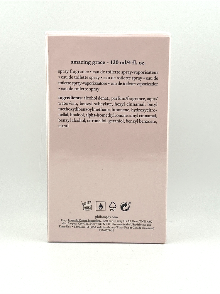Philosophy Amazing Grace Eau De Toilette Spray – 4 Fl. Oz. – New and Sealed in Box Discover the timeless elegance of Philosophy Amazing Grace , a fragrance that embodies the essence of fresh, clean, and feminine beauty. This Eau De Toilette Spray is perfect for anyone who enjoys a light, airy scent that can be worn every day. Features & Benefits: ✔ Fresh, clean, floral fragrance with notes of bergamot, freesia, and musk ✔ Perfect for everyday wear , giving you a subtle and uplifting scent ✔ Long-lasting scent that lingers throughout the day ✔ Sealed in box to ensure freshness and authenticity ✔ Ideal gift for loved ones or as a treat for yourself ✔ Elegant and simple —a signature scent for any occasion Product Details: ✔ Size: 4 Fl. Oz. ✔ Condition: Brand new, sealed in original box ✔ Authentic and high-quality product ✔ Fast shipping for your convenience Indulge in the luxurious simplicity of Philosophy Amazing Grace Eau De Toilette and enjoy a fragrance that is as fresh and graceful as you are.