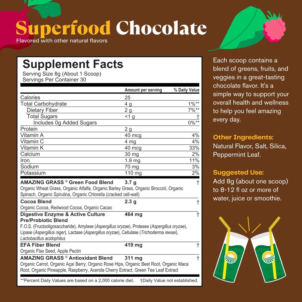 This thoughtfully crafted blend combines our alkalizing farm fresh greens and wholesome fruits and vegetables with nutrient-rich superfoods plus cacao. With a rich chocolate flavor it's an indulgently delicious way to feel amazing every day. Supports overall health and immunity. Full servings of fruits and vegetables. More organic greens than any other greens blend. Certified Organic by CCOF, Gluten Free, No Sugar Added, Plant Based, Non GMO, Kosher Add one scoop with 8 oz. or more of water, juice, or smoothie recipe for a quick breakfast or snack drink. Use when baking to give your cakes, muffins, brownies, or cookies for alkalinity, digestive and immunity support.