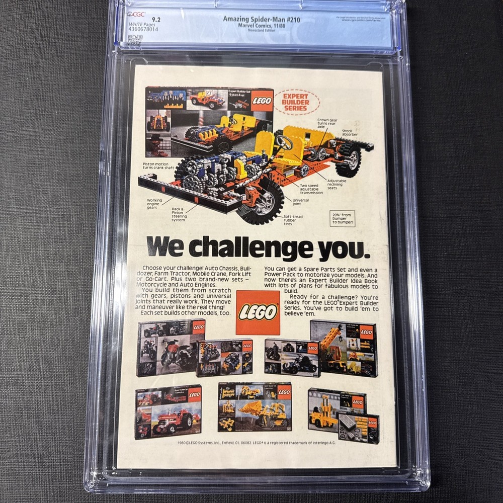 The product is a vintage Amazing Spider-Man comic book issue #210 from 1980, graded CGC 9.2 Near Mint-. This key issue features Spider-Man (Peter Parker) and Madame Web within the Spider-Verse universe, written by Denny O'Neil, John Romita Jr., and Al Milgrom. Published by Marvel, this single issue in English is a part of the Bronze Age era of US Comics, making it a valuable collectible for general audiences interested in classic comic book stories.