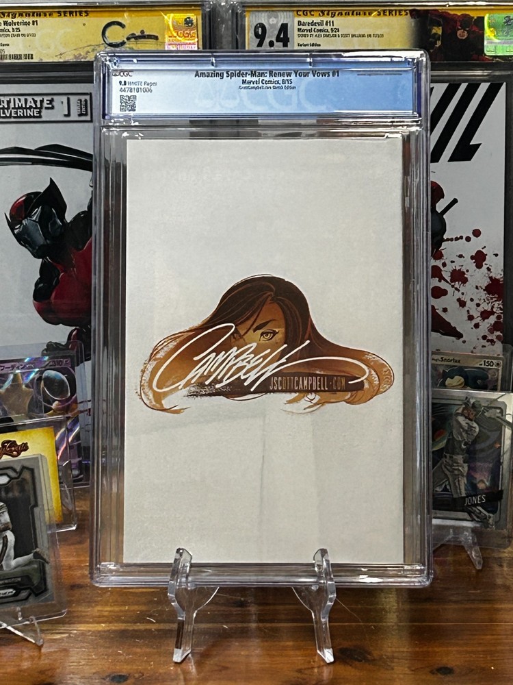 The product is a single issue comic book titled "Amazing Spider-Man: Renew Your Vows #1 (Web Exclusive CGC Graded 9.8)". This comic features characters like Mary Jane Watson and Spider-Man (Peter Parker) and is part of the Spider-Man universe. With a cover variant by artist J. Scott Campbell, this modern age comic from Marvel Comics is intended for a general audience. The story titled "PART ONE: WHY WE CAN'T HAVE NICE THINGS THE LAST SPIDER-MAN STORY" offers a colorful and engaging reading experience for fans of superheroes.