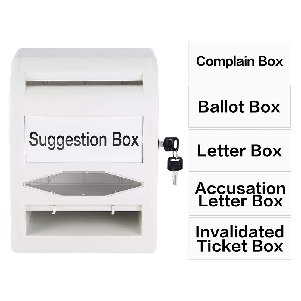 Product Description Amazon Basics ABS Ballot Box With Lock From the Manufacturer Amazon Basics Durable construction: made of rugged ABS plastic in a non-transparent white color Keyed entry: locked box requires a key to open; set of 2 keys are included Versatile: can be used for collecting voting ballots, letters, suggestions, complaints, and more Customizable: 6 replacement tags allow for creating unique signage; front window cover made of plastic protects the tags Warranty: backed by an Amazon Basics 1-year limited warranty