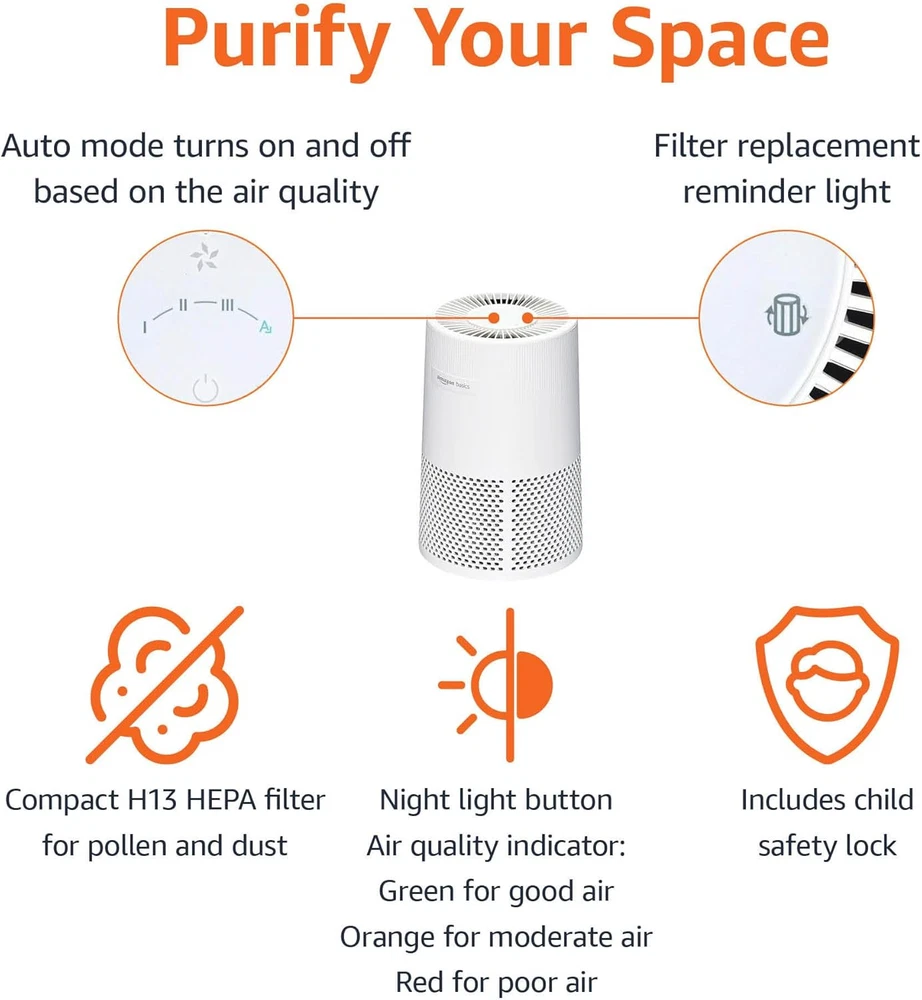 Product Details Color: White Product Dimensions: 9.6"D x 9.6"W x 14.3"H Floor Area: 1067 Square Feet Specification Met: Energy Star Certified Noise Level: 32 dB Controller Type: Button Control Wattage: 31 watts Item Weight: 3.02 pounds Department: consumer_electronics Country of Origin: China Item model number: AC2224A Power SourceItem Weight: Corded Electric3 Pounds Control MethodFilter Type: TouchHEPA PERFECT FOR PET OWNERS & ALLERGY SUFFERERS: Provides 360° air purification with a high Clean Air Delivery Rate (CADR) of 238 m³/h (140 CFM), refreshing air 5 times per hour in rooms up to 213 ft² (20 m²). Ideal for removing pet dander, pollen, and allergens. Outstanding 3-STAGE FILTRATION SYSTEM: Combines a pre-filter, deodorizing filter, and H13 HEPA filter and uses activated carbon to capture 99.97% of particles as small as 0.3 microns, effectively filtering out pet hair, dust, pollen, and other pollutants. (Compound activated carbon deodorizing and H13 HEPA ). REAL-TIME AIR QUALITY MONITORING: Built-in smart sensor detects indoor air quality with LED indicators: Red (“Poor”), Orange (“Moderate”), and Green (“Good”), keeping you aware of your environment’s health. CUSTOMIZABLE COMFORT WITH QUIET OPERATION: Choose from 3 fan speeds or let Auto Mode adjust based on air quality; includes a quiet Sleep Mode (32 dB) that won’t disturb your rest. SLEEK & MODERN DESIGN: With a compact footprint (9.6”D x 9.6”W x 14.3”H), this air purifier complements any room décor while delivering optimal air quality. ENERGY EFFICIENT & ECO-FRIENDLY: Powered by a 31-Watt DC motor and “Energy Star” certified for efficient operation and reduced electricity costs. Important Setup (User Instruction) : The product is delivered with the filter sealed for protection. Please follow the manual to remove the plastic wrap before the first-time use. An Seller Brand
