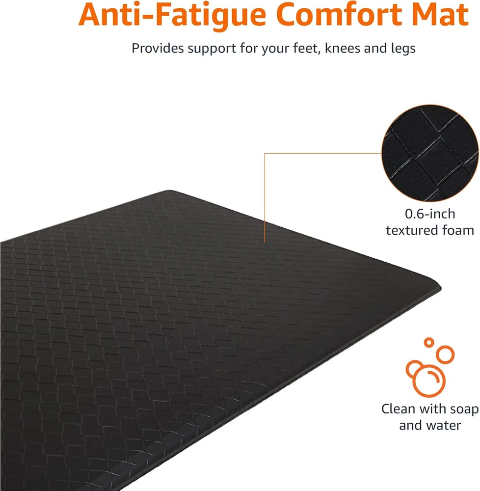 Product Details Color: Black Special Feature: Non-slip,Stain Pattern: Mat Product Care Instructions: Wipe with Damp Cloth Material Type Free: Polyvinyl Chloride (PVC) Free Product Dimensions: 36"L x 20"W x 0.63"Th UPC21 Number of Items: 1 Item Weight: 2.6 pounds Country of Origin: China Item model number: SHP-KP30B-black MaterialShape: FoamRectangular Floor mat for reducing the discomfort and fatigue caused by standing on a hard floor for an extended period of time Includes a black rectangular floor mat made of textured foam for cushioning comfort; stain and abrasion resistant Conforms to the contours of the foot; provides support for feet, knees, and legs Non-curling edges stay flat to prevent tripping; non-slip design keeps the mat securely in place Ideal for a kitchen, laundry room, standing desk, or work station Cleans easily with soap and water Note: wipe up water that gets on or under the mat to prevent slipping; if mat edges curl, discontinue use Product dimensions: 36 x 20 x 0.6 inches (LxWxH) Product Description An Seller Brand. From the Manufacturer Seller Basics