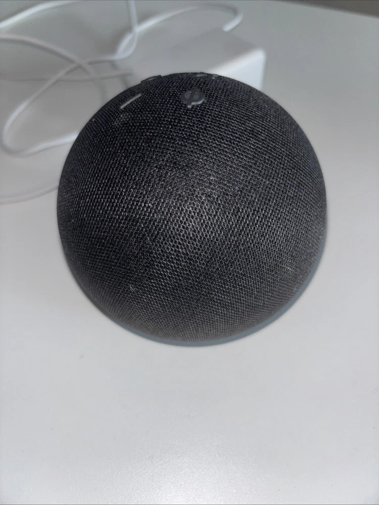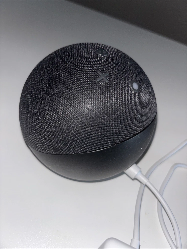 The Amazon Echo Dot 5th Gen. Smart Speaker in Charcoal is a black sphere-shaped smart speaker from Amazon's brand. It was manufactured in 2022 and features Bluetooth and Wi-Fi connectivity. This model is compatible with Alexa for smart home integration.
