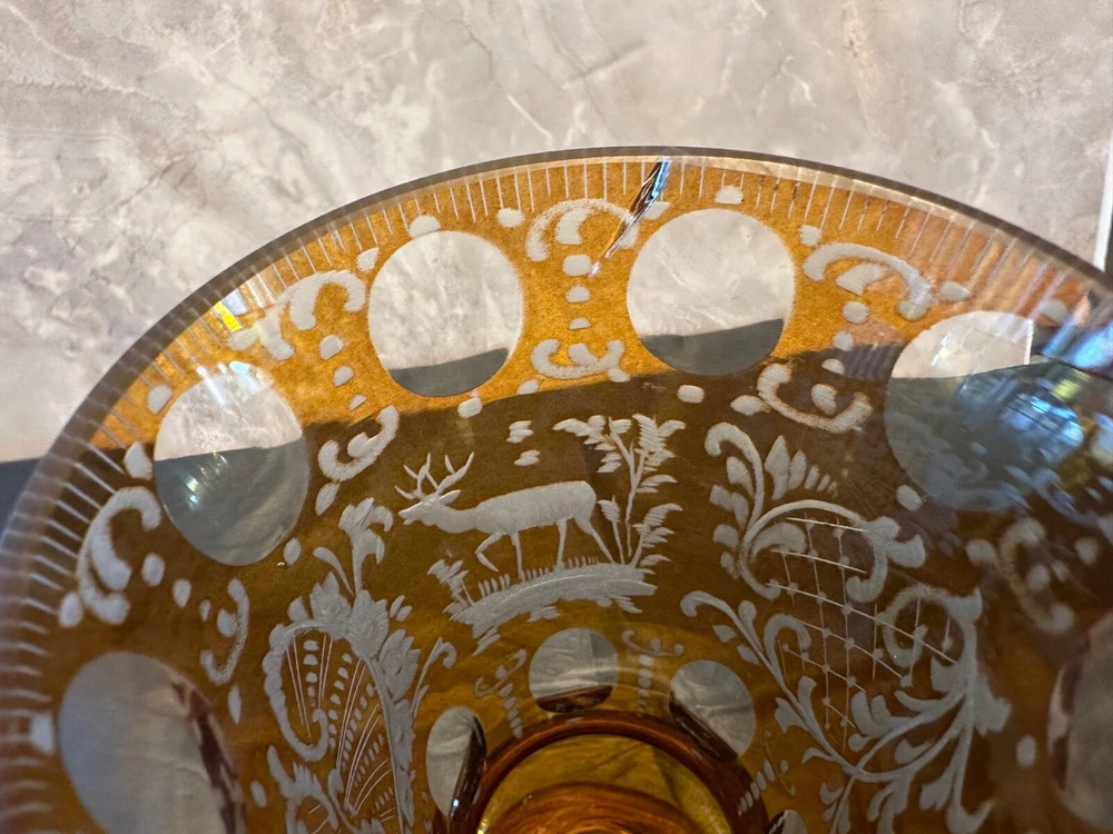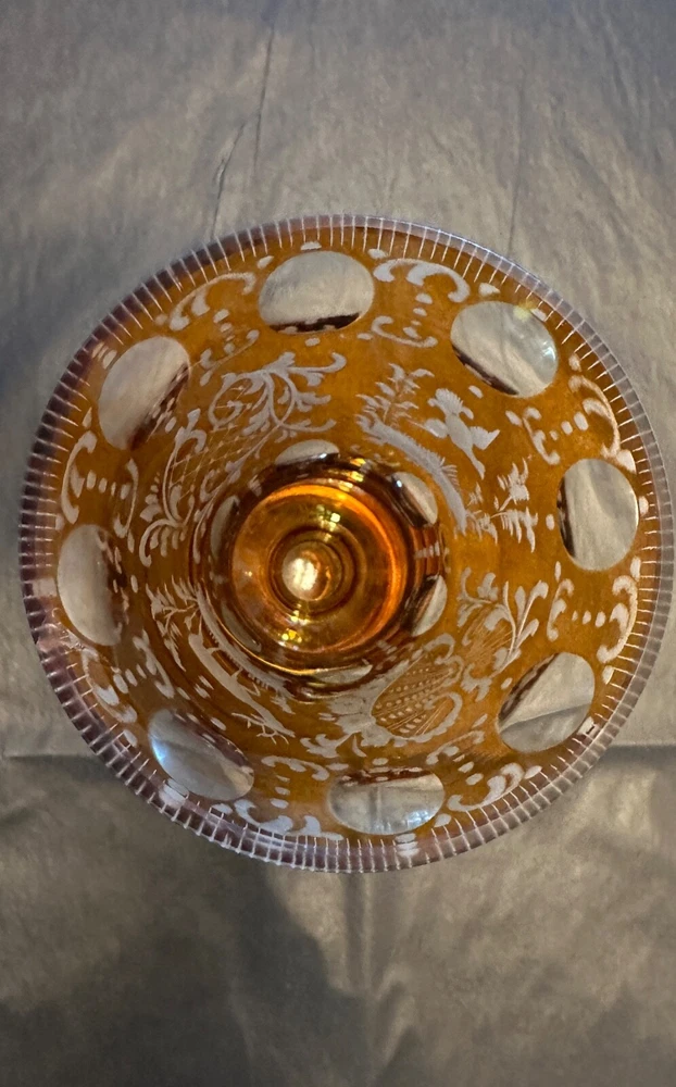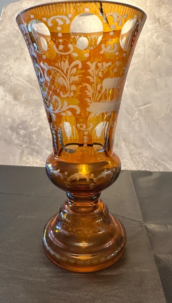 Storage unit find. I do not know much about it other than it’s an Egermann Amber Etched Vase. Has a small Chip on the rim and the bottom of the vase has scratch marks , looks like from it being moved around. Would love to keep but I do not have the room for it. Sold as is review pictures for additional details.