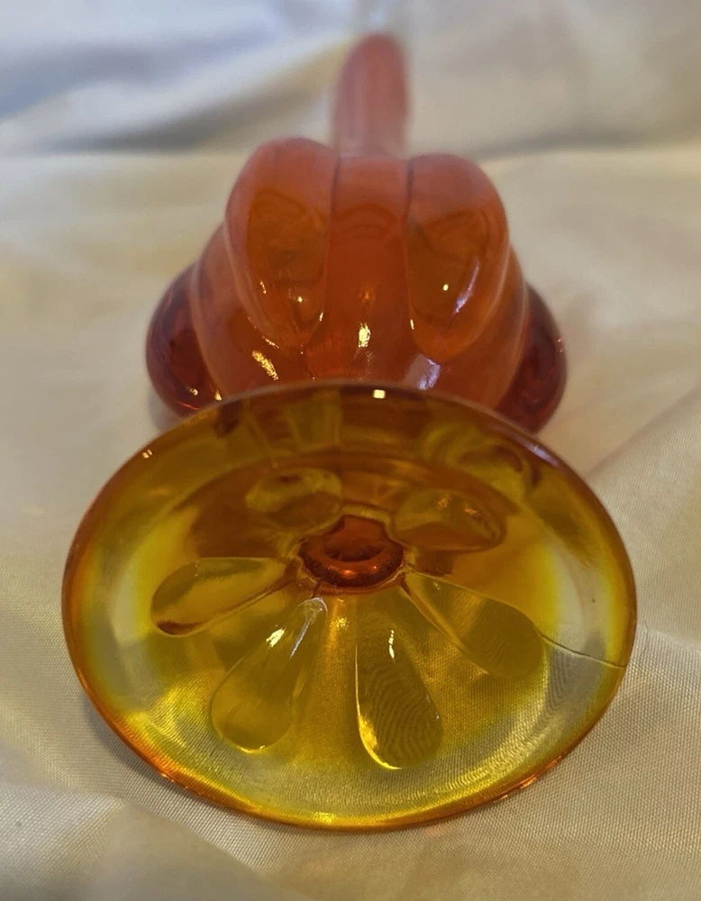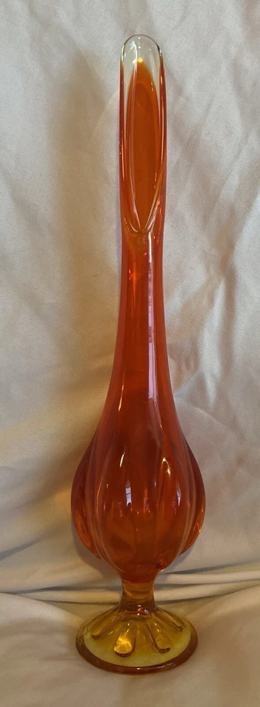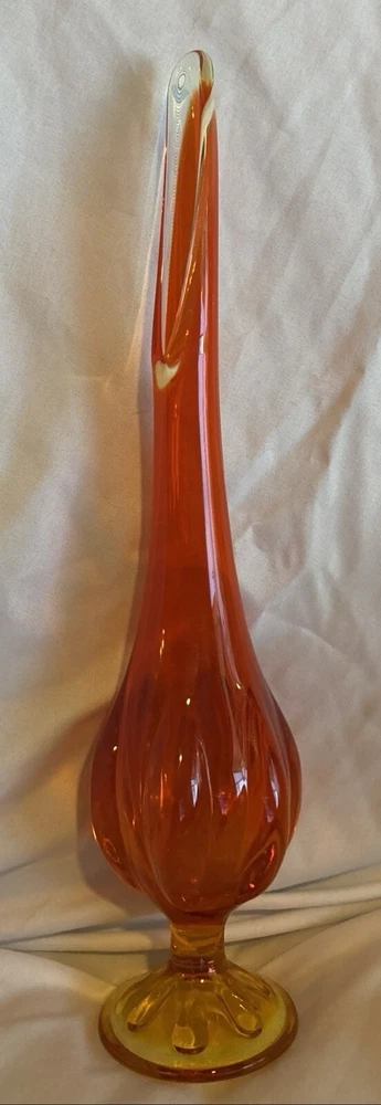 This beautiful vase is a stunning example of mid-century modern art glass. The amberina color and swung pattern make it a unique addition to any collection. Measuring at 12 1/4 inches, this vase is in excellent used condition and would make a great addition to any home decor. The vase is perfect for displaying flowers or as a standalone piece. Don't miss out on the opportunity to own this unique and beautiful piece of art glass.