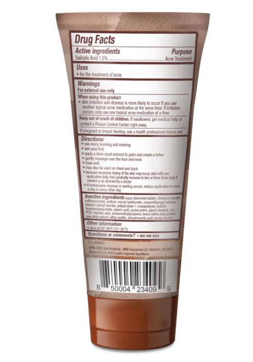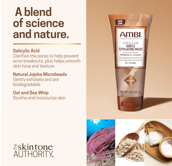 About This Item 🧼 Gentle Exfoliating Facial Cleanser This rich, creamy daily facial wash helps gently exfoliate the skin by removing surface impurities and dead skin cells, revealing a softer, smoother, and more even-looking complexion. ✨ Balanced & Soothing Formula Formulated with Salicylic Acid to help keep pores clear, along with Oat and Sea Whip extracts to soothe and hydrate the skin. Naturally biodegradable Jojoba Microbeads help improve skin texture without harsh scrubbing. 🌿 Designed for Daily Skincare Routines Suitable for everyday use as part of a regular skincare regimen to help maintain a fresh, clean, and healthy-looking appearance. 🧴 Complete Skincare Approach Part of a broader skincare collection including cleansers, bar soaps, serums, moisturizers, and creams created to support even-looking skin tone and overall skin care needs. 🌎 Trusted Skincare Heritage For over 50 years, Ambi has focused on developing accessible, high-quality skincare products inspired by the needs of melanin-rich and diverse skin tones. ⚠️ Please Note This is a cosmetic product intended for external use only. Results may vary. Not intended to diagnose, treat, cure, or prevent any medical condition.