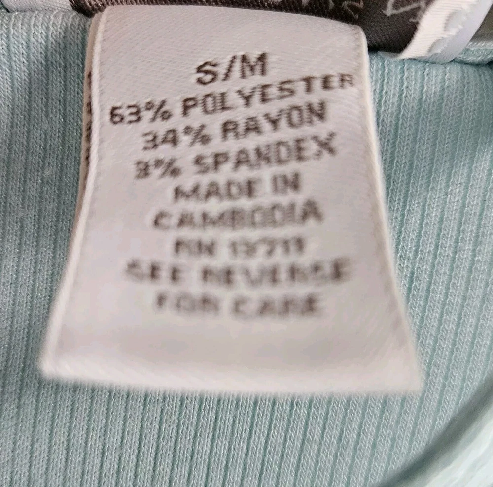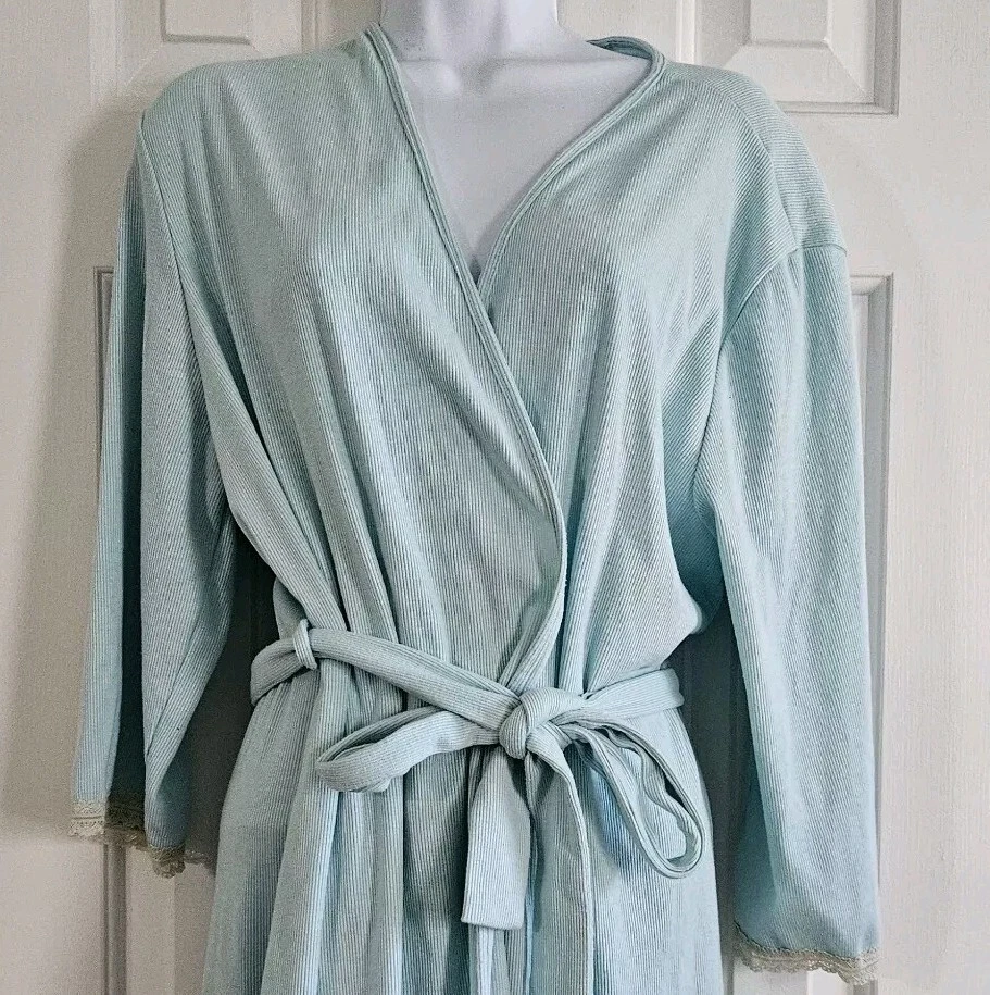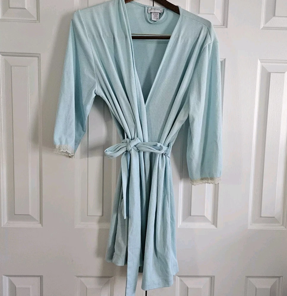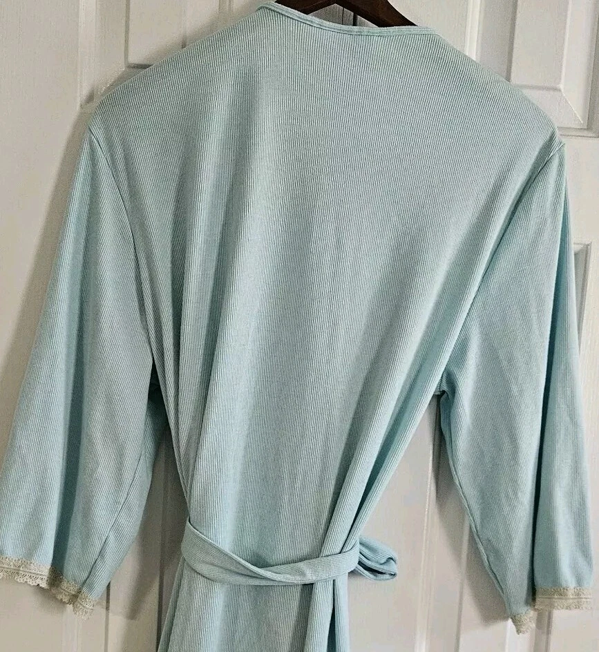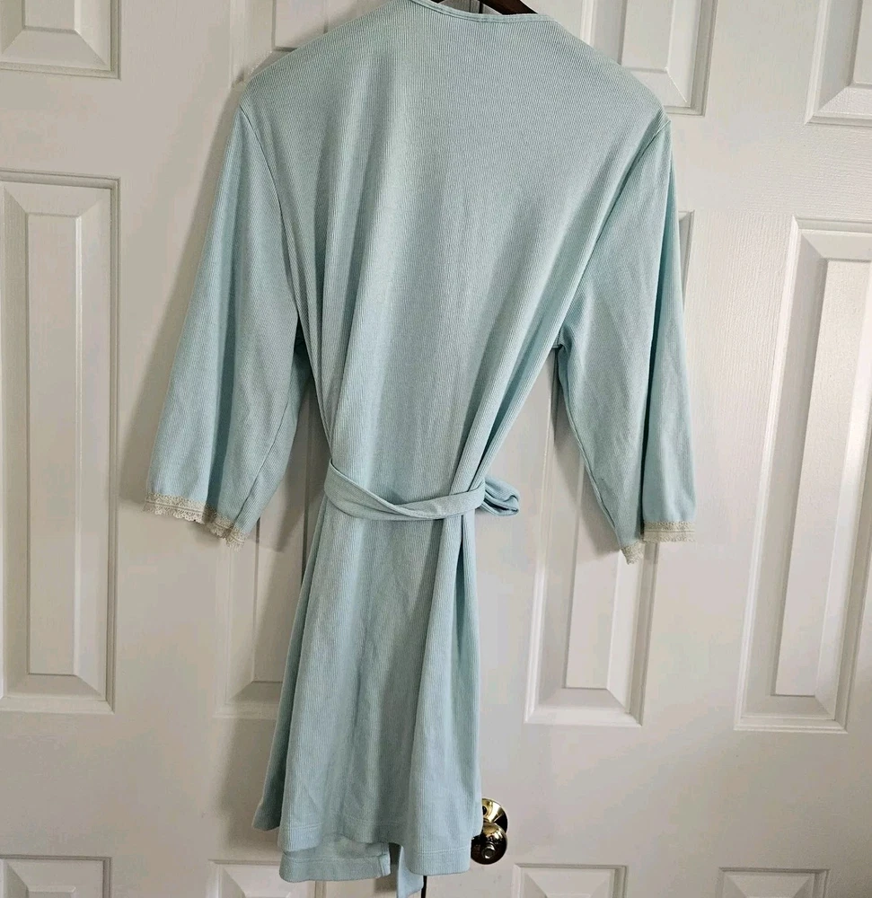 Amelia's Collection Short Robe Good pre-owned condition, no flaws 63% polyester, 34% rayon, 3% spandex, lightweight ribbed knit Color is a pastel mint green blue Ivory lace trim on sleeves Belted, belt not attached to robe Pockets at hips 3/4 Sleeves Shorter lengths, falls a few inches above knee Marked a size S/M Approximate measurements 34 inches in length from top of shoulder to bottom of hem in front
