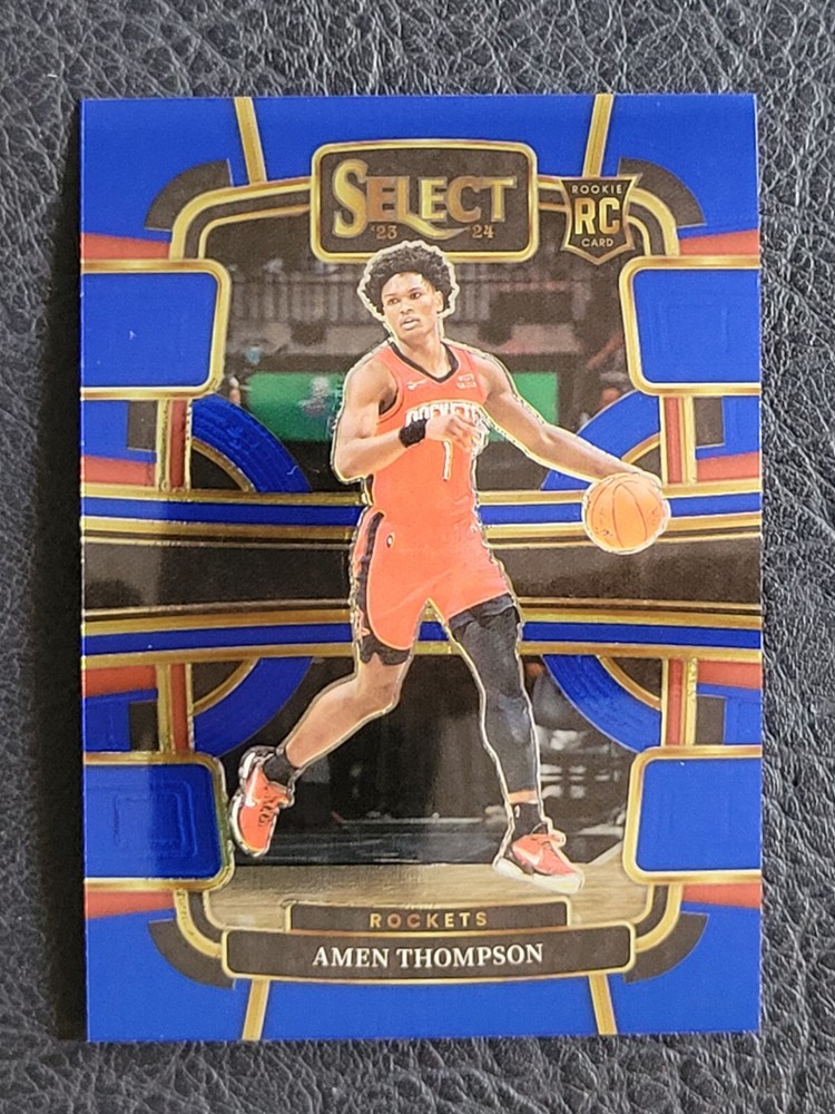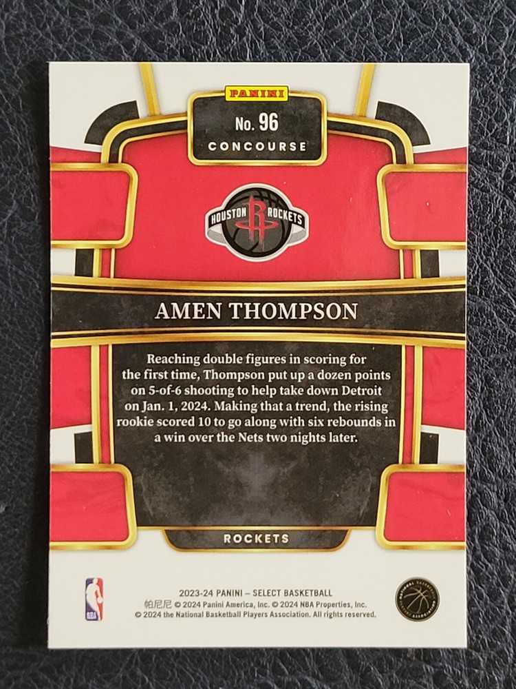 Amen Thompson 2023-24 Phoenix Instant Impact Rookie & Select Concourse 96 Rocket trading card features the player from the Houston Rockets in the NBA Finals. This sports trading card is part of the 2023-24 Panini Select and 2023-24 Panini Phoenix sets, made of card stock in English. It includes a base set and an insert, representing a rookie card with a total of 2 cards in the collection.