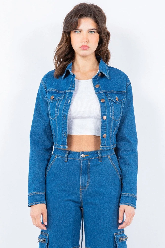 A denim laced back cropped jacket features a button front closure, cropped length, and laced back trims. This stylish piece offers a unique twist on the classic denim jacket silhouette, adding a touch of modern flair to your outfit. The button front closure provides a secure fit, while the cropped length offers a trendy and versatile look. The laced back trims add a playful and eye-catching detail, perfect for those looking to make a fashion statement. Whether paired with jeans for a casual day out or layered over a dress for a night out, this jacket is sure to elevate your style effortlessly. Add a denim laced back cropped jacket to your wardrobe for a chic and on-trend piece that you'll love to wear. Features: Lace-Up, Washed, Buttoned Stretch: Slightly stretchy Material composition: 70% cotton, 28% polyester, 2% spandex Care instructions: Machine wash cold. Tumble dry low. Imported Product measurements: S:Bust 34-36 in, Waist 26-28 in M:Bust 37-38 in, Waist 29-31 in L:Bust 39-40 in, Waist 32-33 in