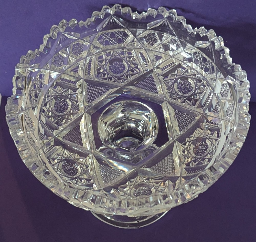American Brilliant Cut Crystal Compote Pedestal Bowl EUC 6" Tall 7" Dia No chips or cracks noted. Some tiny flea bites in the design. Great American Brilliant Cut crystal.