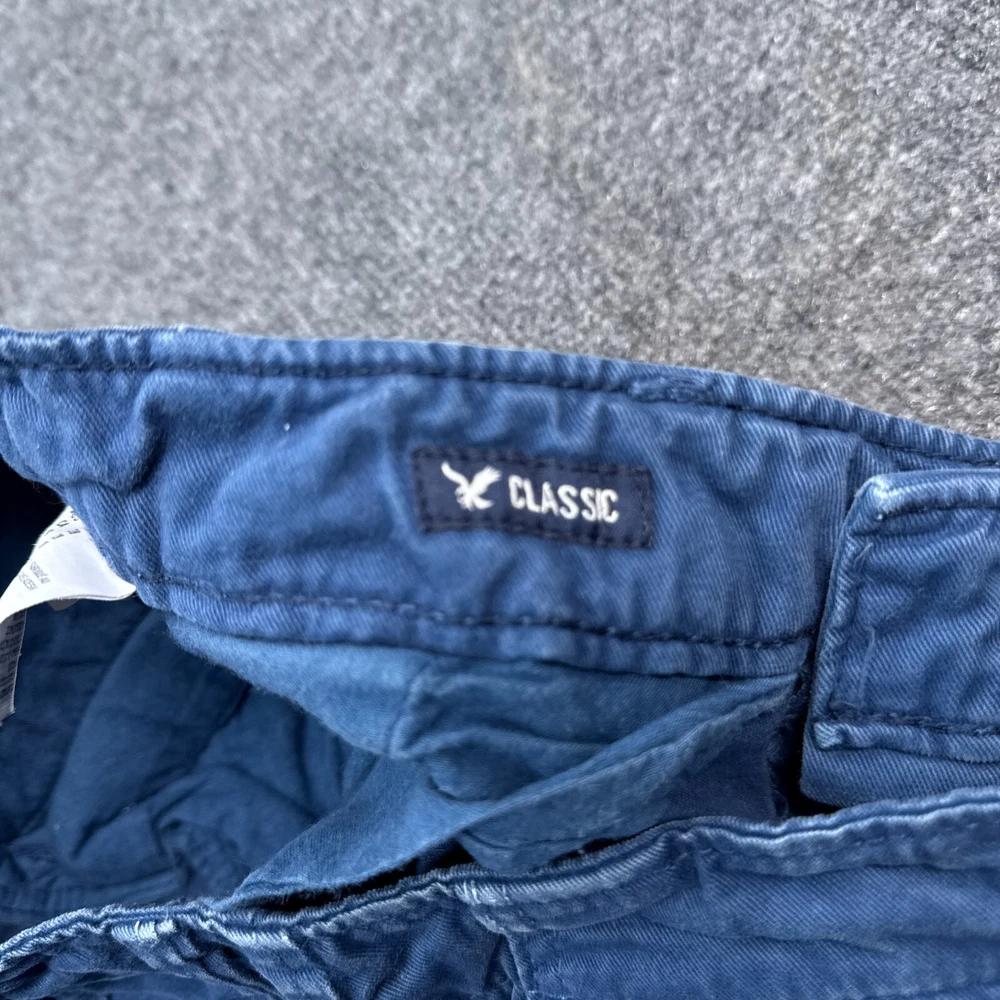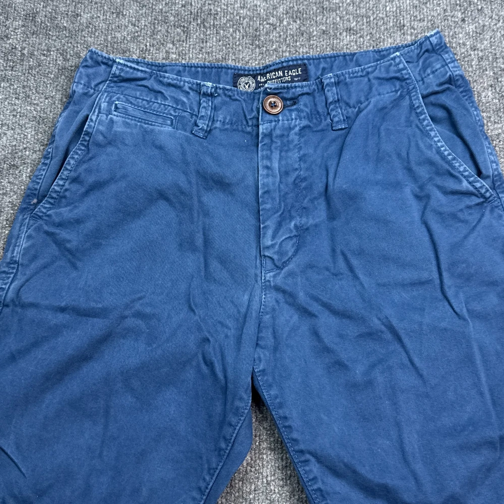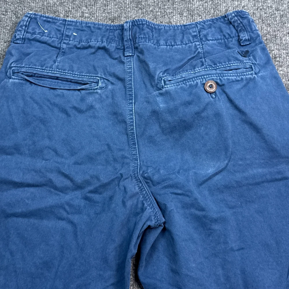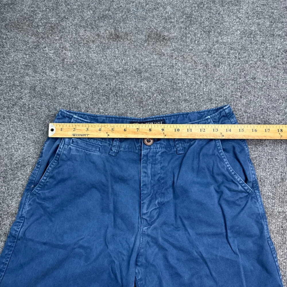 Waist Size: 28 in Size: 28 Front Type: Flat Front Department: Men Color: Blue Pattern: Solid Occasion: Casual Season: Fall, Spring, Summer Style: Chino Garment Care: Machine Washable Fabric Wash: Medium Brand: American Eagle Outfitters Theme: American Features: Pockets, Stretch Closure: Button Pocket Type: Slash Pocket Size Type: Regular Personalize: No Accents: Logo Rise: Mid (10-12 in) Material: Cotton Fabric Type: Canvas Vintage: No Fit: Classic Handmade: No