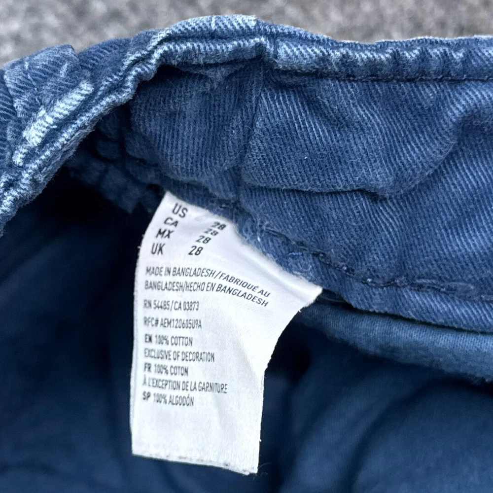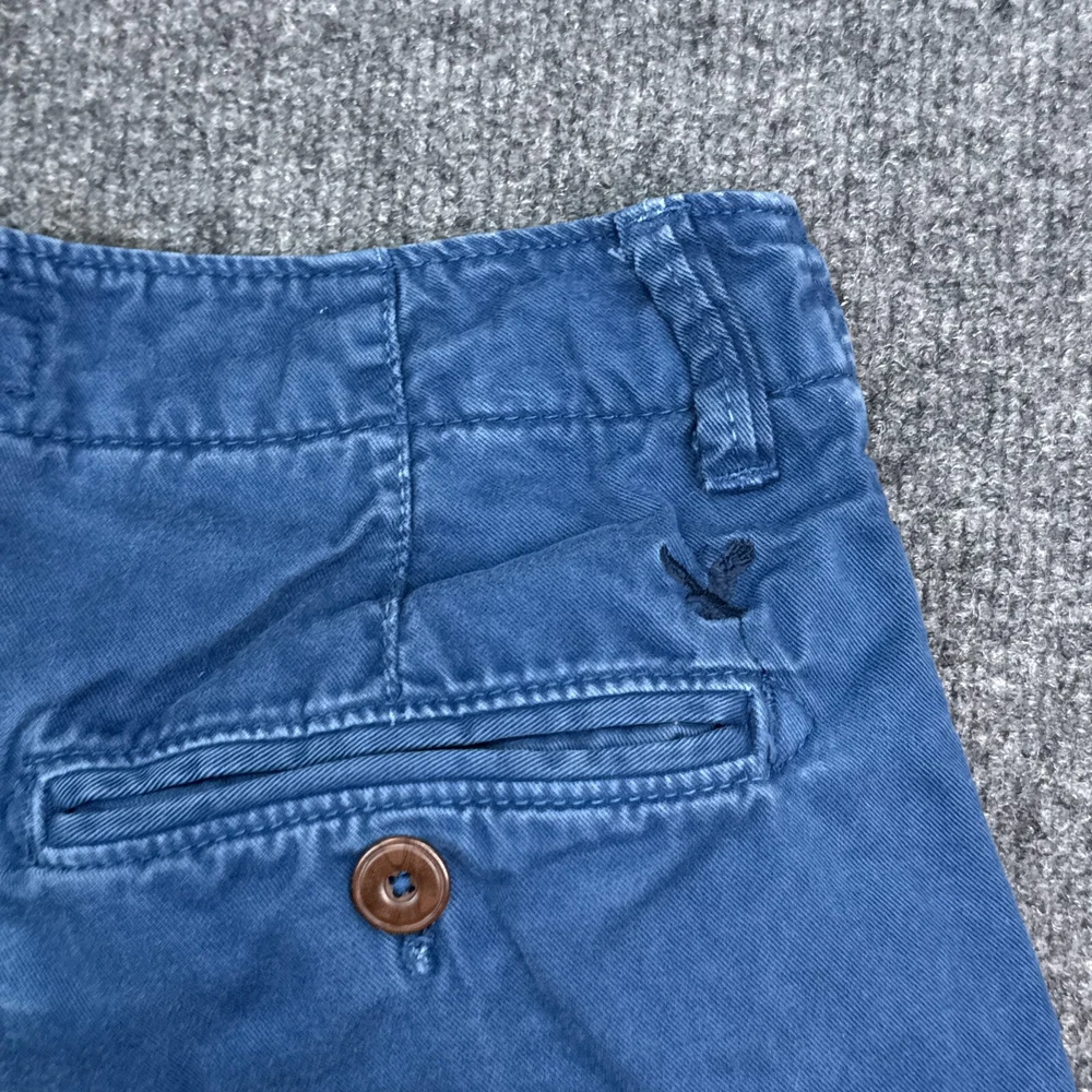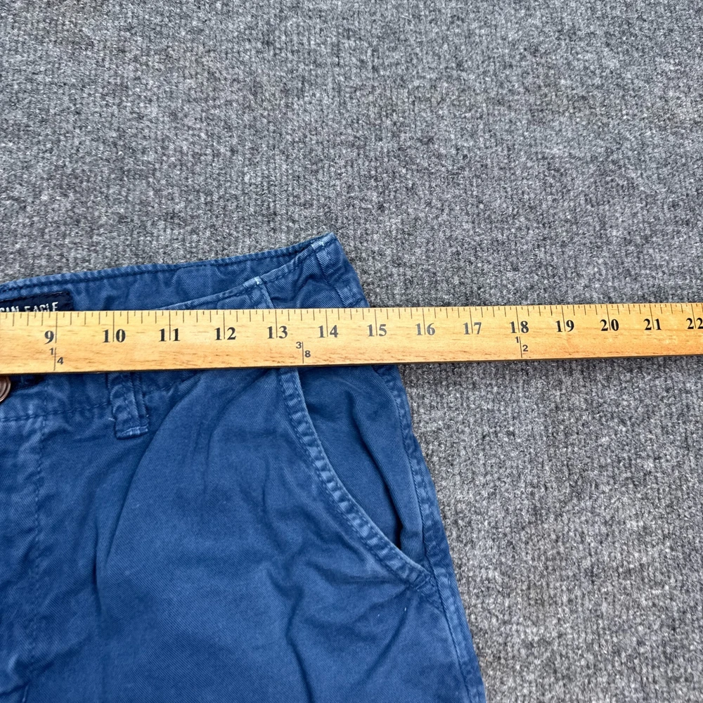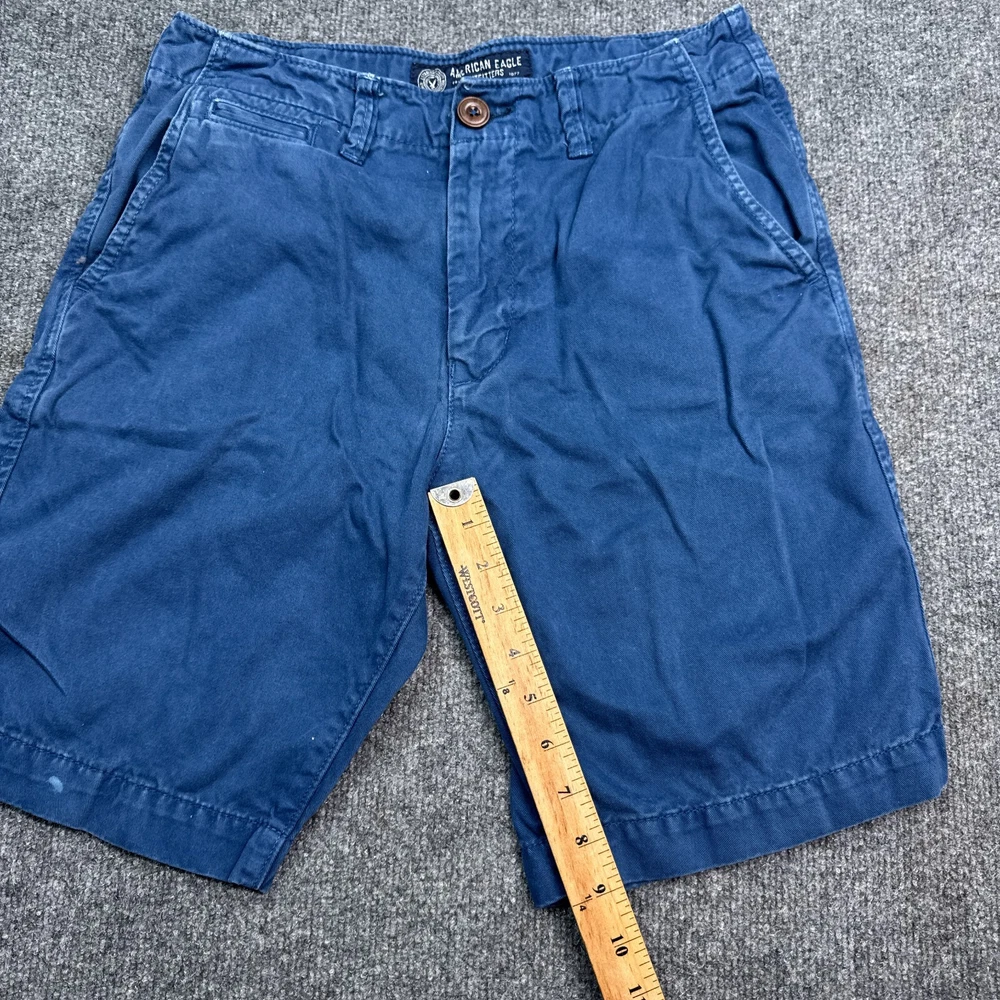 Waist Size: 28 in Size: 28 Front Type: Flat Front Department: Men Color: Blue Pattern: Solid Occasion: Casual Season: Fall, Spring, Summer Style: Chino Garment Care: Machine Washable Fabric Wash: Medium Brand: American Eagle Outfitters Theme: American Features: Pockets, Stretch Closure: Button Pocket Type: Slash Pocket Size Type: Regular Personalize: No Accents: Logo Rise: Mid (10-12 in) Material: Cotton Fabric Type: Canvas Vintage: No Fit: Classic Handmade: No