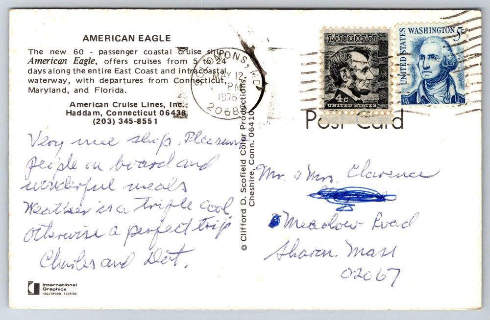 American Eagle Coastal Cruise Ship CT MD FL East Coast C1970s Postcard AA24