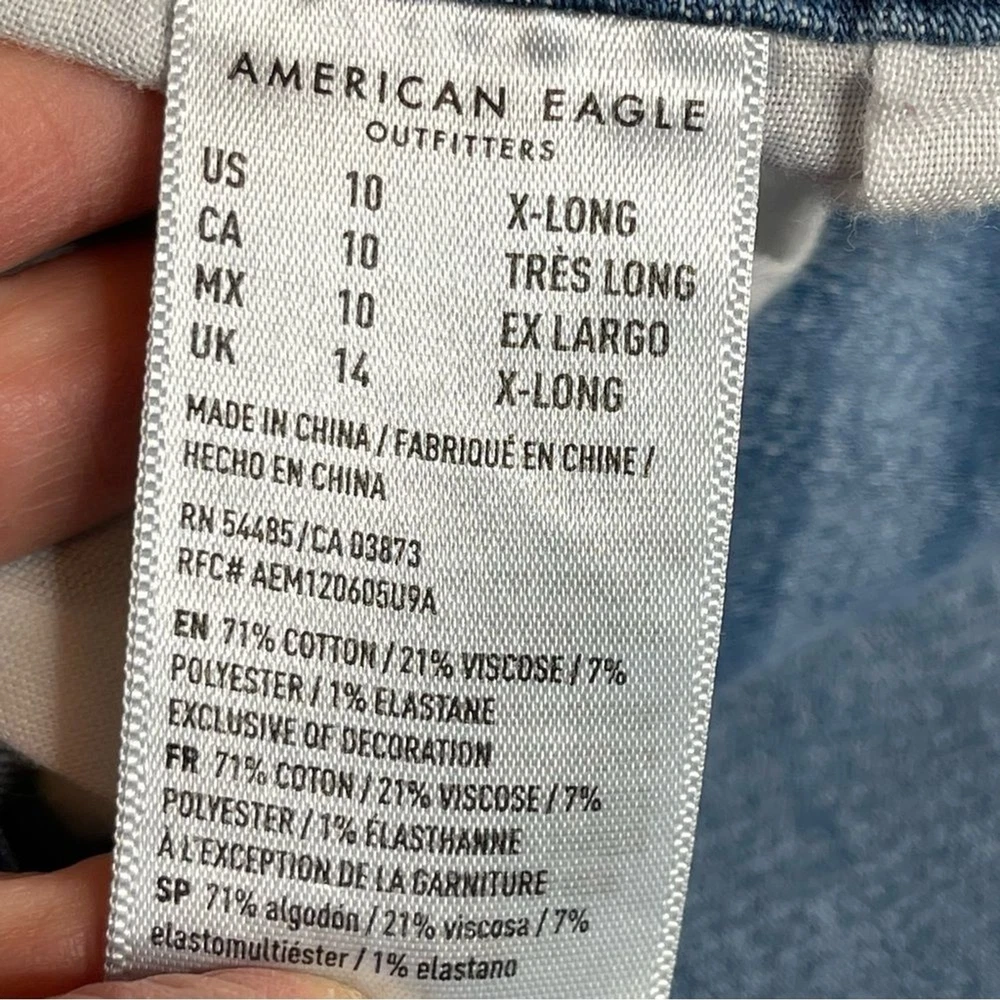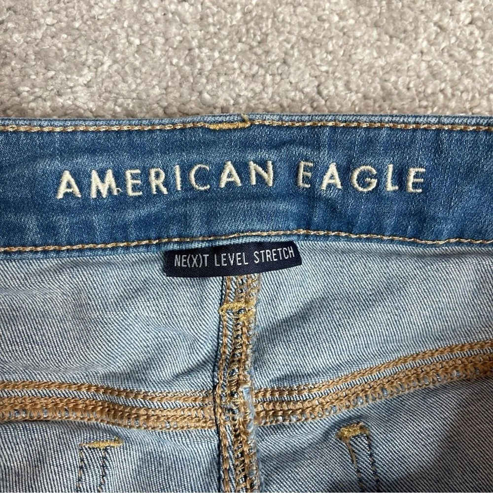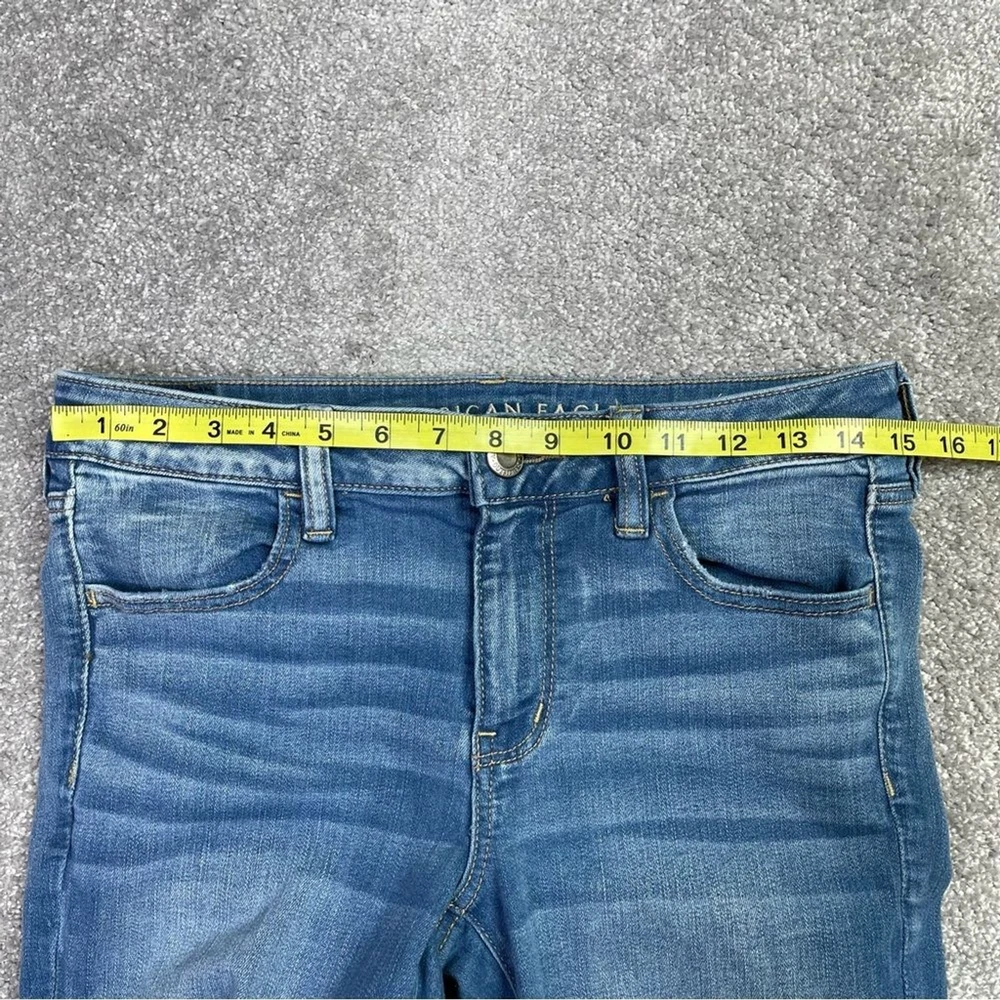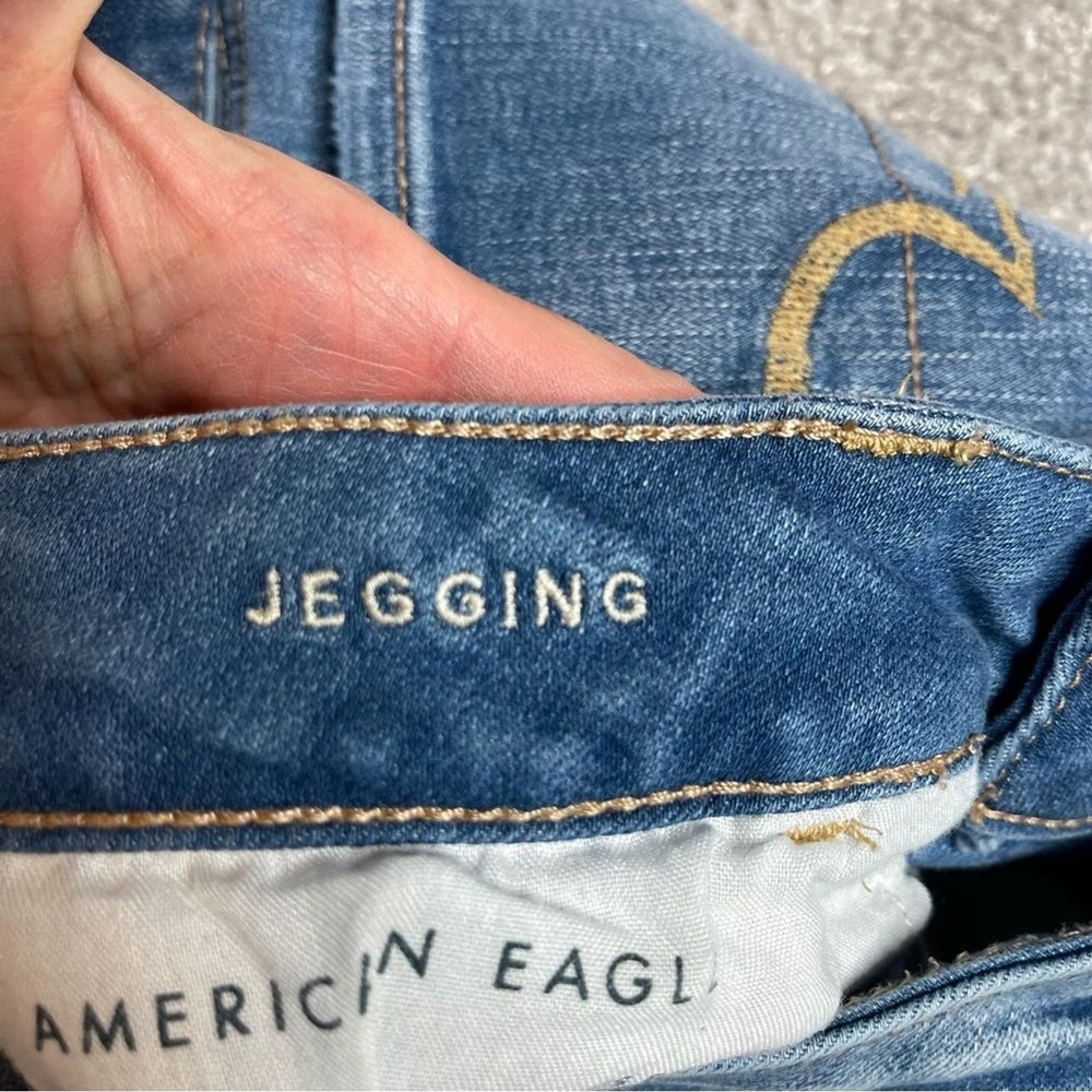 Vintage: No Accents: Logo Rise: Mid (8.5-10.5 in) Color: Blue Waist Size: 30 in Style: Jegging Pocket Type: 5-Pocket Design Season: Fall, Spring, Summer, Winter Inseam: 31 in Personalize: No Seller Notes: “In excellent, pre-owned condition with no flaws to note.” Handmade: No Pattern: Solid Garment Care: Machine Washable Size: 10 Tall Size Type: Tall Brand: American Eagle Outfitters Department: Women Type: Jeans Country/Region of Manufacture: China Theme: Preppy Model: American Eagle Jegging Material: Cotton Blend Closure: Zip Fabric Type: Denim Fabric Wash: Medium Features: Distressed, Pockets, Stretch Fit: Regular