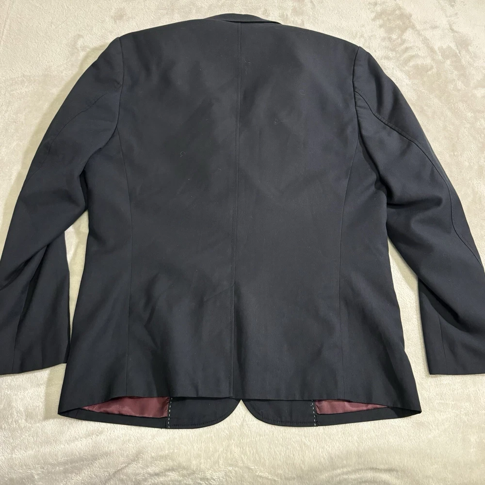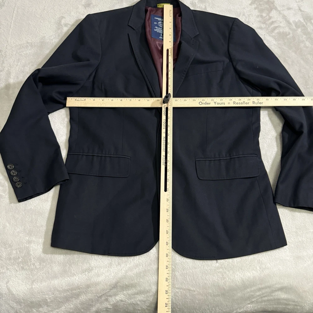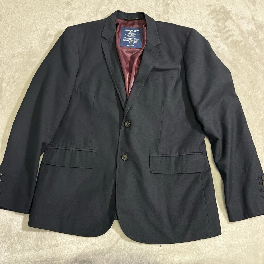 Size: L Number of Pieces: 1 Theme: Sports Size Type: Regular Season: Fall Lining Material: None Jacket Lapel Style: Notch Vintage: No Brand: American Eagle Outfitters Material: Blend Fit: Slim Pattern: Solid Fabric Type: Blend Jacket/Coat Length: Regular Style: Jacket Waist Size: N/A Jacket Front Button Style: Two-Button Jacket Cut: Single-Breasted Type: Blazer Occasion: Business, Casual, Formal, Party/Cocktail, Travel, Wedding Department: Men Color: Blue