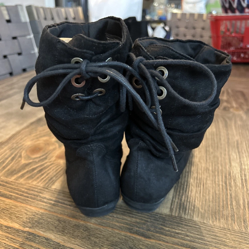 Elevate your shoe game with these stylish American Eagle Outfitters ankle booties in black suede. The almond toe and pull-on closure make them comfortable for everyday wear, while the low block heel adds a touch of sophistication for work or formal occasions. The perforated accents and cotton lining material give them a trendy yet versatile feel, perfect for any season or outfit. These booties come in a women's size 6 and are made with high-quality leather and synthetic outsole material. Whether you're going out with friends or attending a business meeting, these ankle booties are the perfect addition to your wardrobe.