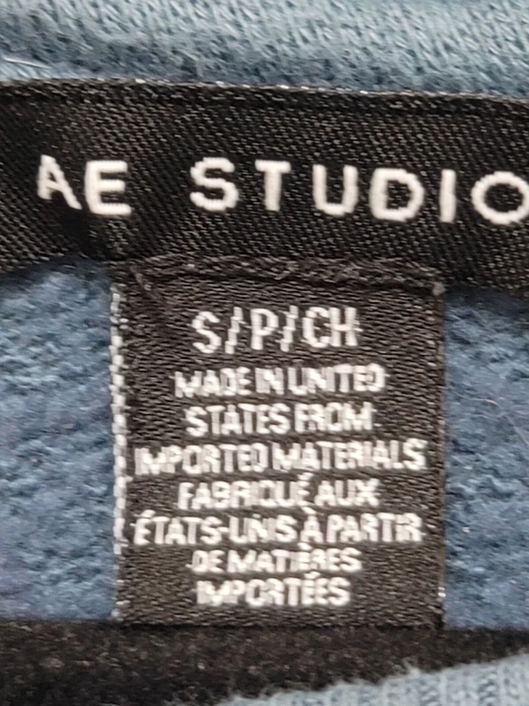 Closure: Pullover Type: Sweatshirt Performance/Activity: Driving, Walking Color: Light Blue Sleeve Length: Long Sleeve Size Type: Regular Fabric Type: Blended Fabric Material: Cotton, Polyester, Fleece, Cotton Neckline: Crew Neck Country of Origin: United States Style: Pullover Character: Blue Pattern: Solid Size: S Lining Material: Polyester Brand: American Eagle studio Seller Notes: “USE MINOR PILLING. GOOD CONDITIONS. SEE PHOTOS FOR FLAWS DETAILS” Vintage: No Occasion: Activewear Department: Women Theme: American Season: Fall, Spring, Winter