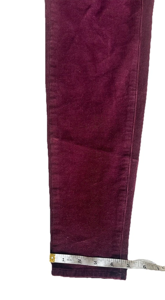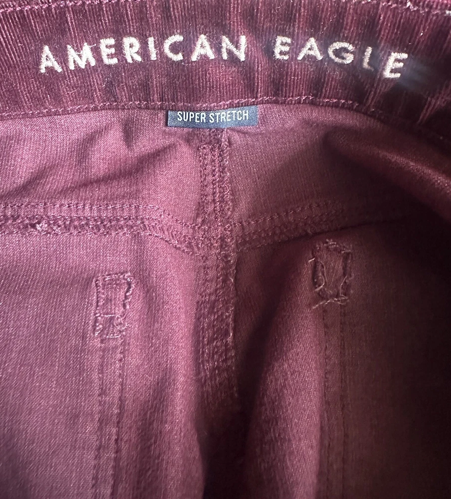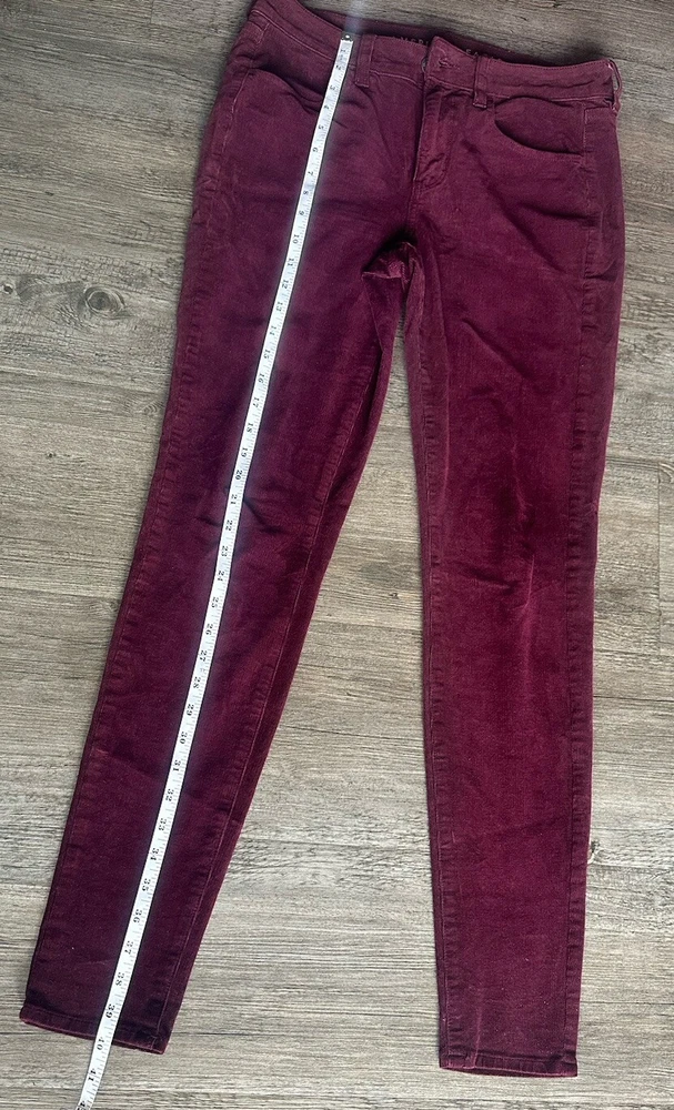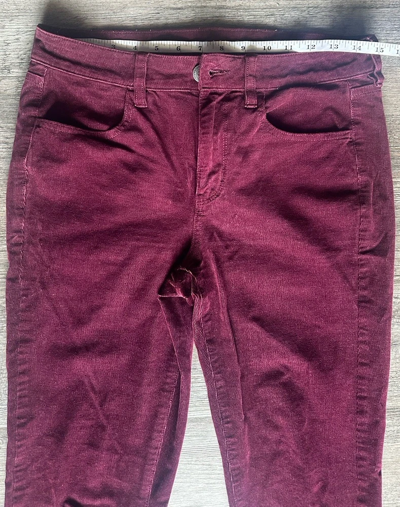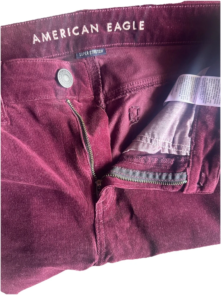 Elevate your denim game with these American Eagle Outfitters burgundy jegging corduroy jeans. Featuring a high-rise waist and a zipper and button closure, these jeans are both stylish and comfortable. The 4-pocket design and solid pattern provide ample space for your belongings, while the light fabric wash adds a touch of sophistication. Crafted from a cotton blend material, these jeans are perfect for all seasons and are available in size 6. The American Eagle jegging model is a classic fit with a 29.5-inch inseam and is ideal for any occasion. Add a touch of 90s nostalgia to your wardrobe with these timeless jeans. It’s pre-owned 👈