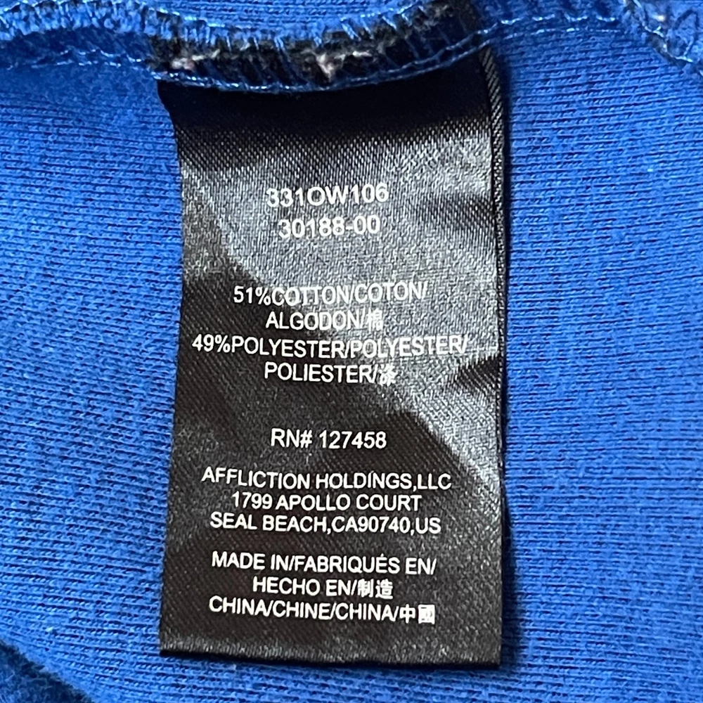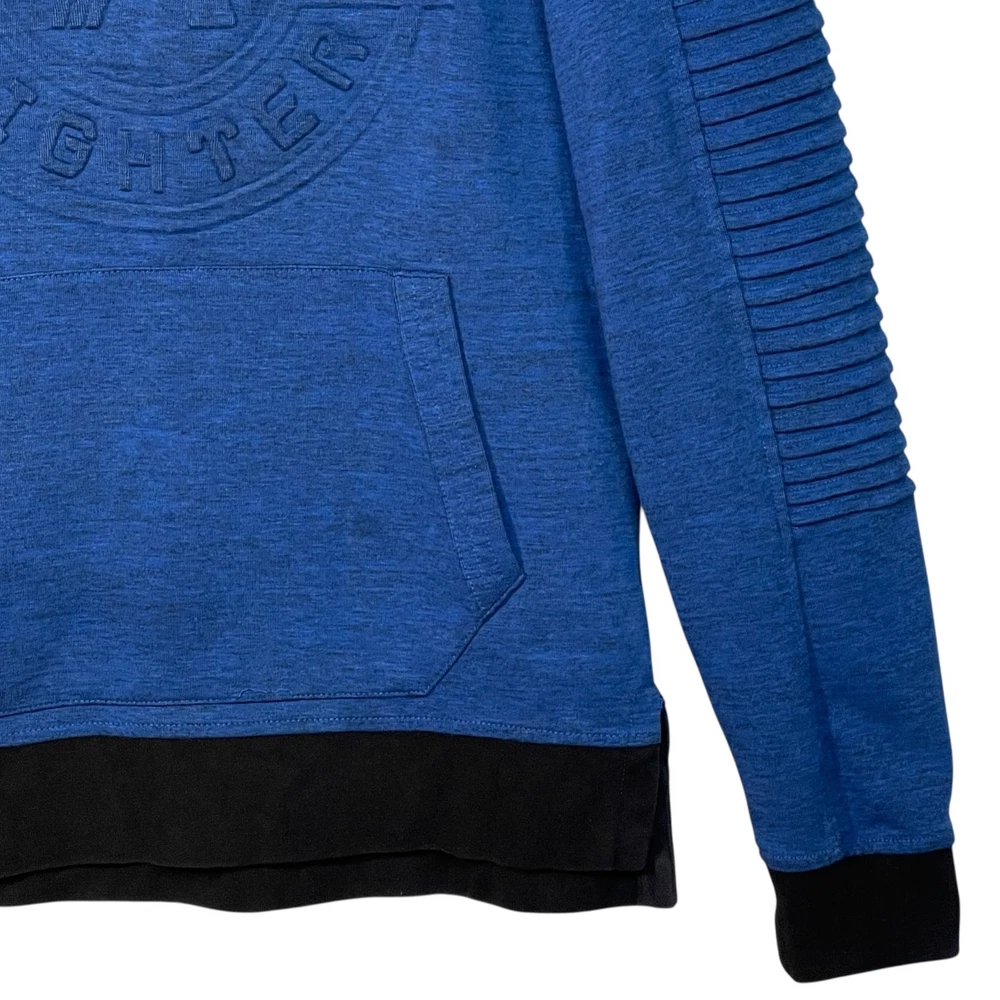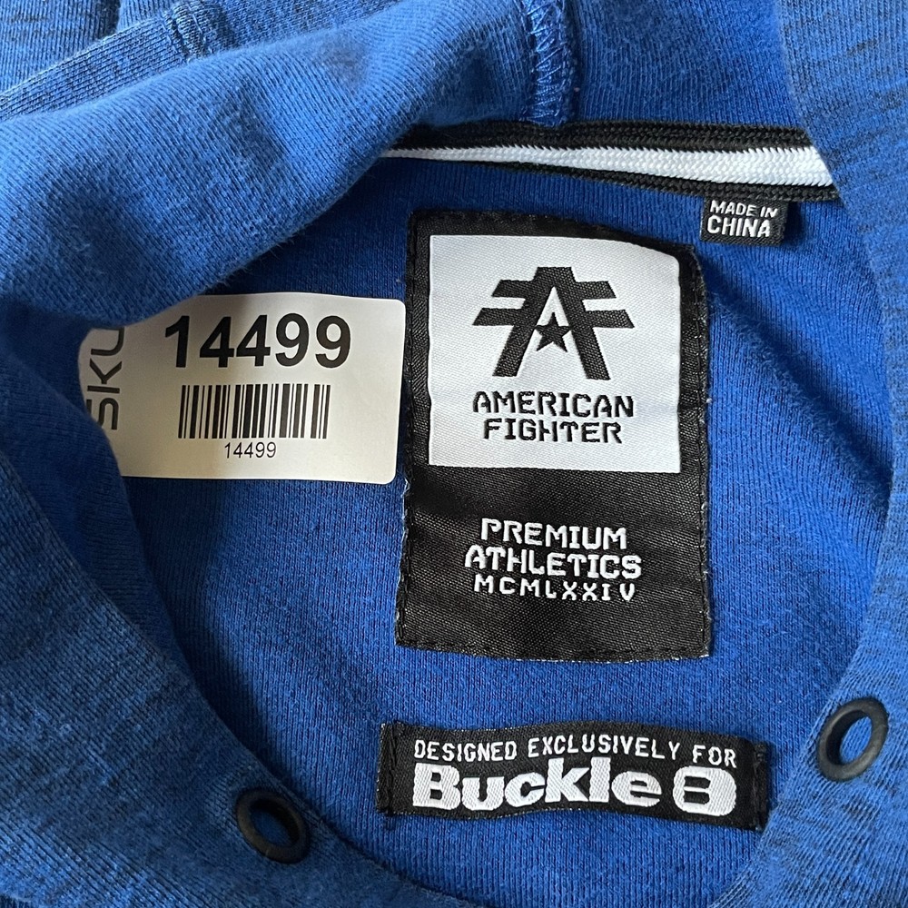 American Fighter by Affliction - Exclusive for Buckle Hoodie Showcase your style with this bold pullover hoodie from American Fighter's exclusive collection for Buckle. This hoodie features the brand's signature edgy aesthetic, with a large embossed logo on the chest and textured moto-style panels on the shoulders and sleeves. The heathered blue fabric is accented with a black colorblock hem and cuffs, creating a standout look. Perfect for casual wear, the gym, or showing off your MMA-inspired style. Sizing Note: There is no size on the tag. Based on a pit-to-pit measurement of 20 inches, this fits like a Men's Large (L). Please review all measurements carefully to ensure a proper fit. Condition Note: This item is in good pre-owned condition overall, but it does have a small, faint stain near the front kangaroo pocket, as shown in the photos. The price has been reduced to reflect this flaw. Features: Brand: American Fighter (by Affliction) Collaboration: Designed Exclusively for Buckle Size: Fits like Men's Large (L) - Please see measurements Color: Heathered Blue & Black Style: Pullover Hoodie Details: Large embossed American Fighter graphic on the chest Moto-style ribbed panels on shoulders and sleeves Kangaroo front pocket Colorblock cuffs and hem Material: 51% Cotton, 49% Polyester Flat Lay Measurements (Approximate): Pit to Pit: 20" Sleeve Length: 26" Length: 27" Care: Machine wash in cold water, tumble dry low. From a smoke-free home. Ships fast! Keywords: American Fighter, Affliction, Buckle, Hoodie, Sweatshirt, Mens, Large, L, Pullover, Moto, Biker, MMA, Gym, Athletic, Graphic, Embossed, Textured, Heather Blue, Black, Colorblock, RN 127458, SKU 14499