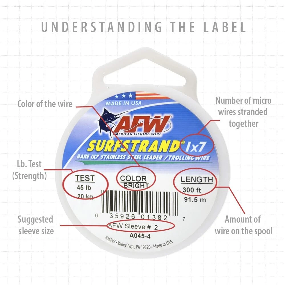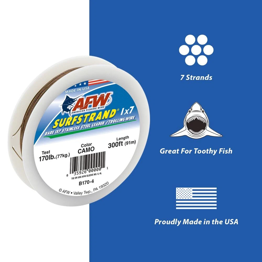 Material Type: Stainless Steel Color: Camo Brown Model: B060-0 Item Width: 2.4 inches UPC: 035926003019 Item Length: 2.4 inches Binding: Sports Size: 30 Feet, 60 Pound Test PartNumber: B060-0 Title: American Fishing Wire Surfstrand Bare 1x7 Stainless Steel Lead... Type: FISHING_LINE Part Number: B060-0 Line Type: Does not Apply Manufacturer: American Fishing Wire Item Height: 0.7 inches MPN: Does not apply Brand: American Fishing Wire Product Type Name: FISHING_LINE Product Group: Sports Release Date: 2011-03-23 Studio: American Fishing Wire gtin13: 035926003019 Publisher: American Fishing Wire Label: American Fishing Wire
