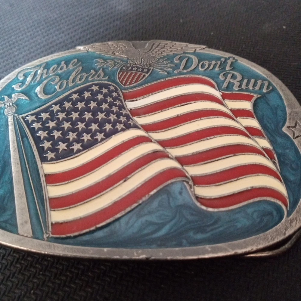 This Belt Buckle features a patriotic design with an American flag motif and an eagle in blue enamel. Produced by Buckle Bakery, it is a casual accessory suitable for men. The multicolor design lends itself to a cowboy & western theme, making it a stylish addition to any outfit. Crafted from metal, this belt buckle is a sturdy and durable piece that showcases American pride with its bold colors and imagery.