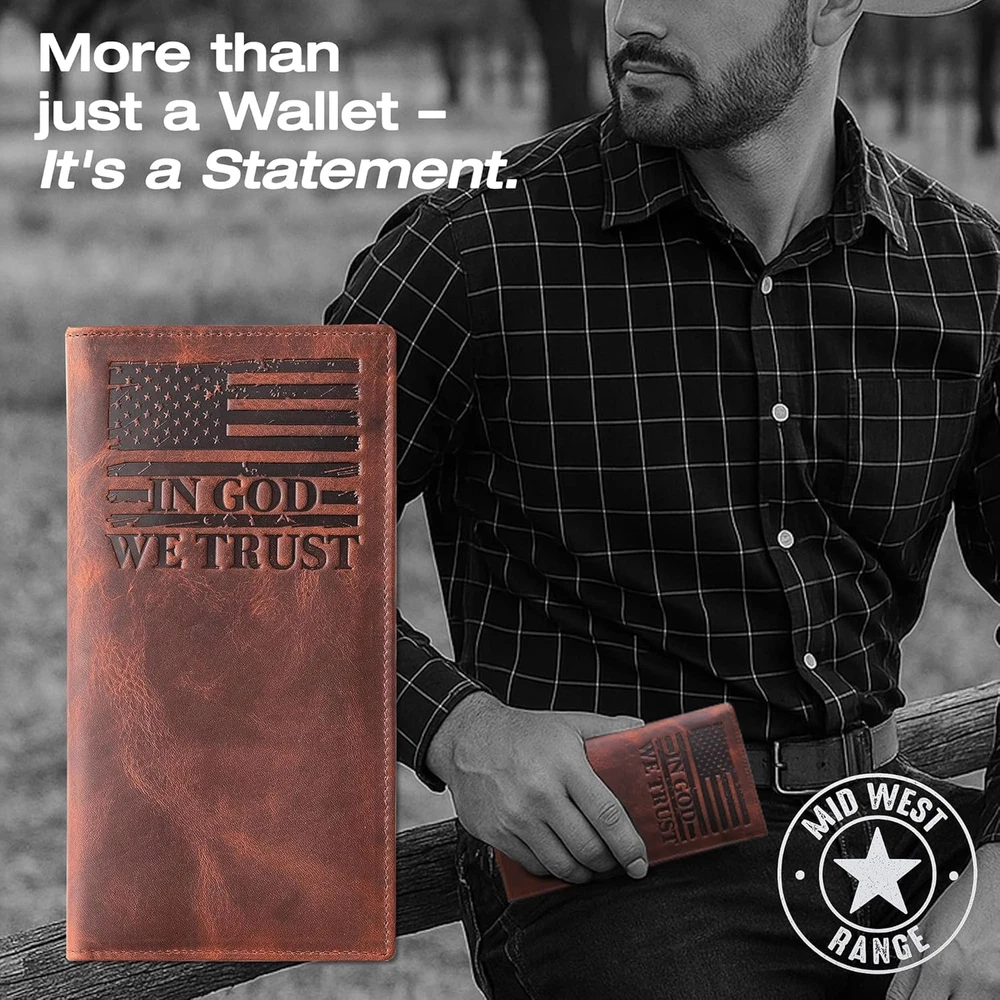 Store New Arrivals Add to Favorite View Feedback Contact Fast deliveries to the customer's home Quality customer service John Make the customers happy! American Flag Long Wallet for Men - Western Wallets for Men with ‘IN GOD WE TRUST’ – Distressed Full Grain Leather – RFID Blocking Long Bifold Cowboy Wallet – Patriotic Christmas Gift (7 Inches) Description SHOW YOUR PATRIOTIC PRIDE – Carry a symbol of faith, freedom, and American heritage with this Leather wallet for men. Embossed with the U.S. flag and “IN GOD WE TRUST,” this piece reflects craftsmanship and conviction. Ideal for those who appreciate patriotic wallets, cowboy wallets, or western wallets for men. A thoughtful men’s wallet Holiday gift that honors both tradition and personal values—great for dad, husband, or anyone proud of their roots. CLASSIC WESTERN DESIGN – This long bifold men’s wallet delivers rugged appeal and authentic western style in a tall, slim silhouette. Built for men who value function and tradition, it fits comfortably in pockets or bags and complements jeans or dress wear alike. Use it as a trucker wallet, cowboy wallet, or rodeo wallets for men, that brings the spirit of the American West into everyday life. SPACIOUS YET SLIM STORAGE – Designed for organization without bulk, this leather wallets for men offers 9 card slots, a photo ID window, and large compartments for bills, checks, and receipts. It’s the ideal slim wallet for men—balancing function and style for modern living. Whether used as a bifold wallet or western wallet, it keeps your essentials secure and accessible while maintaining a sleek, pocket-friendly profile. GENUINE FULL GRAIN LEATHER – Crafted from real distressed leather, each men’s leather wallet is one-of-a-kind in tone and texture. Built to endure years of use, it develops rich character and softness over time, aging beautifully like a true cowboy wallet. This brown leather wallet stands for durability, craftsmanship, and masculine charm—making it a unique Holiday gift for him or a lifelong keepsake. RFID BLOCKING SECURITY – Stay protected from digital theft with built-in RFID blocking technology that helps shield your cards and personal data. Whether for travel, daily use, or gifting, this western wallet for men blends timeless craftsmanship with modern safety. A great leather wallet Christmas gift under $50 for dad, husband, or boyfriend—designed for men who value authenticity, durability, and American pride. TRIBUTE TO SERVICE: Built from premium craftsmanship, this full-grain leather wallet honors the strength and commitment of our veterans from the Marines, Army, Air Force, and Navy. Designed for everyday carry, it reflects years of dedication and discipline with rugged durability and timeless style. Thoughtfully crafted, it stands as a lasting tribute among gifts for heroes—a symbol of service, integrity, and pride that never fades. Product description FEEL THE FREEDOM At Mid West Range, we love the openness and freedom of the American Midwest. Whether you're into fishing, hunting, rodeo, farming or camping, we aim to bring you products that are authentic and real. Crafted in specialty leather houses our designs showcase what we love about the great outdoors. Full Grain Premium Leather Built to last from the finest full grain leather, this long wallet for men only gets better with age. From sunup on the farm to sundown on the trail, it’s durable enough to handle it all. Whether you call it a check book wallet mens, tall wallet, or trucker wallet, this rugged essential stands up to your daily grind while gaining a rich patina that's uniquely yours. RFID Blocking Stay one step ahead of modern threats with advanced RFID blocking technology. Protect your hard-earned money and personal information from digital thieves without sacrificing style or functionality. Uniquely Yours Each leather wallets for men long bifold is hand-finished, making every one truly unique. Like a well-worn saddle, your men long wallet will develop its own character and story over time—reflecting the life you lead and the legacy you build. No two real leather wallets for men are the same. THE ULTIMATE MIDWESTERN GIFT Want the perfect gift for a man who loves the land, lives free, and works hard? The Tall Wallet is a symbol of what it means to be from the Midwest—faithful, tough, and always ready for the next adventure. Our range is designed to speak out loud about; Freedom. Family. Faith. The Midwest. Item model number 'MID-WEST-RANGE-VERTICAL-WALLET-001 Style The Patriot American Flag Rodeo Wallet Color Vintage Brown Pattern American Flag Product Dimensions 4 x 7 x 1 inches Material Leather Item Weight 1.65 Ounces Department Mens ABOUT US We offer the best prices around on high quality products. Our E-store includes media such as books, movies, music and games while offering electronics, toys, sporting apparel, clothing, tools, general home, garden items and more. SHIPPING We are always working hard to ensure your package arrives as soon as possible. Please understand that some factors like weather, high postal traffic, and the performance of shipping companies are outside of our control. We offer free shipping to the lower 48 states and ship within 2 business days of payment, usually sooner. We do not accept P.O. Boxes. Please provide a physical address. For shipping outside of the continental USA, we only use eBay's Global Shipping Program. The item is shipped to KY and then sent to the rest of the world. International customers are responsible for all duties and taxes. Continue to 'check out' to calculate costs for shipping the item to your country. Messages regarding eBay's Global Shipping Program MUST be directed at eBay EXCLUSIVELY. RETURNS We offer a 30-Day Return Policy on items in which you are not completely satisfied with. You have the option of a full-refund or an exchange of the item. No returns are available on items shipped outside of the USA P