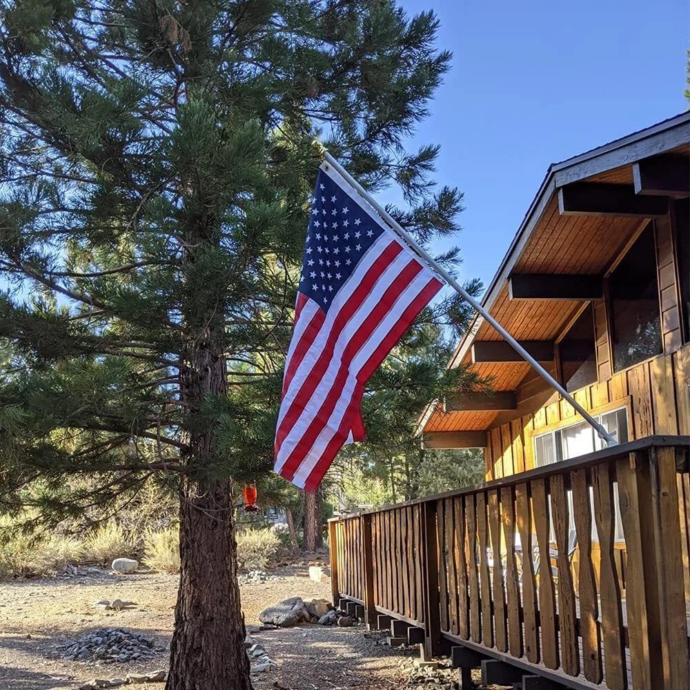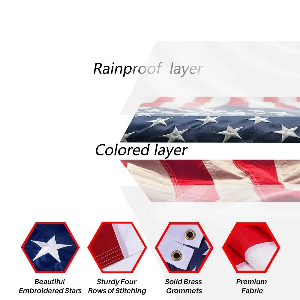 Feature: - Commercial grade polyester of double layer in advanced sew skill for better quality - Fully dyed by aniline to color the fabric for more vivid, brighter and lasting longer result - UV fade resistant, rain resistant, wind resistant, withstand windy condition, flying 24/7 all day long - Dense embroidered white stars on a blue background, with fine sewn red and white stripes - Lock stitch on every seams, hems & fly ends for strong shape to fly against all weather - Size #2 grommets of solid brass & rolled rim, insert into duck cloth header to ensure heavy duty use - All GZ622 flags are professionally made and with 90 days worry-free purchasing promise. - Imported. GZ622 choose the Top #1 MANUFACTURER to make flags, thus you have the VERY SELECTED QUALITY BUT CHEAPER PRICE. Package: 1x American Flag 2.5x4 FT 1x Silver Flag Pole 1x Flagpole Holder with Screws Flag The Day: President’s Day - 3rd Monday in Feb National Day of Prayer - 1st Thursday inMay Armed Forces Day - 3rd Saturday in May Memorial Day - Last Monday in May (Half-Staffuntil Noon) Navy Day – Oct 27th Veterans Day – Nov 11th Christmas Day – Dec 25th Thanksgiving Day – 4th Thursday in Nov Flag Day – June 14th Independence Day – July 4th Constitution Day – Sept 17th Labor Day – 1st Monday in Sept