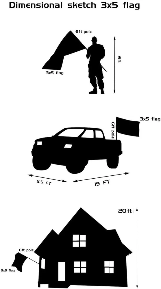 After the flagpole durability test, Anodized Outer Shell has 57% longer life than ordinary aluminum. So we increase the period by 50% Feature: - Commercial grade polyester of double layer in advanced sew skill for better quality - Fully dyed by aniline to color the fabric for more vivid, brighter and lasting longer result - UV fade resistant, rain resistant, wind resistant, withstand windy condition, flying 24/7 all day long - Dense embroidered white stars on a blue background, with fine sewn red and white stripes - Lock stitch on every seams, hems & fly ends for strong shape to fly against all weather - Size #2 grommets of solid brass & rolled rim, insert into duck cloth header to ensure heavy duty use - All flags are professionally made and with 90 days worry-free purchasing promise. - GZ622 choose the Top #1 MANUFACTURER to make flags, thus you have the VERY SELECTED QUALITY BUT CHEAPER PRICE. Package: 1x American Flag 3x5 FT 1x Silver Grey Pole 1x Flagpole Holder with Screws Flag The Day: President’s Day - 3rd Monday in Feb National Day of Prayer - 1st Thursday inMay Armed Forces Day - 3rd Saturday in May Memorial Day - Last Monday in May (Half-Staffuntil Noon) Navy Day – Oct 27th Veterans Day – Nov 11th Christmas Day – Dec 25th Thanksgiving Day – 4th Thursday in Nov Flag Day – June 14th Independence Day – July 4th Constitution Day – Sept 17th Labor Day – 1st Monday in Sept ✔Complete American Flag Pole Kit - This American flag pole kit contains everything you need, which includes a 3x5 feet polyester US flag, a no-tangle flagpole, and a white adjustable flag pole mounting bracket with screws. It will effectively save you time in finding the correct size of flagpole or holder for your American flag. Display the American flag pole kit proudly and show your patriotism! ✔Delicate American Flag - This 3x5 Ft USA flag is made of 100% polyester for long-lasting use. Imported. It features beautifully embroidered stars, heavy-duty brass grommets, and sturdy sewn stripes, as well as lock stitching in every seam, hem, and fly end with great wind resistance. The brass grommets are quite sturdy and are also easy to attach to the hooks of the flag pole. You will fully appreciate the outstanding craftsmanship and quality of this flag. ✔6FT 360° Spinning Flag Pole - Compared to other flag poles on the market, flag poles feature premium aluminum alloy for durability and a 360-degree rotating design. There are two sections for the flag pole, it is very easy to interlock them together. The free-rotating design will protect your flags from tangling or furling, which helps to display the best view of your flag. The plastic ring of the flag pole is adjustable to fit flags of different sizes. ✔ Multi-Position Flag Pole Bracket- Made of aluminum, our flagpole holder is thicker and more durable than other brackets on the market, which is stable and will not be easy to break. It is multi-position and it can be easily adjusted to any angle you like with the thumb screw. It is convenient to install the bracket on the wall with the screws included. ✔- This 3x5 FT American flag pole kit is ideal for residential or commercial use. We stand behind our products! All items sold by come with a 3-month . If there is any problem, kindly let us know it.