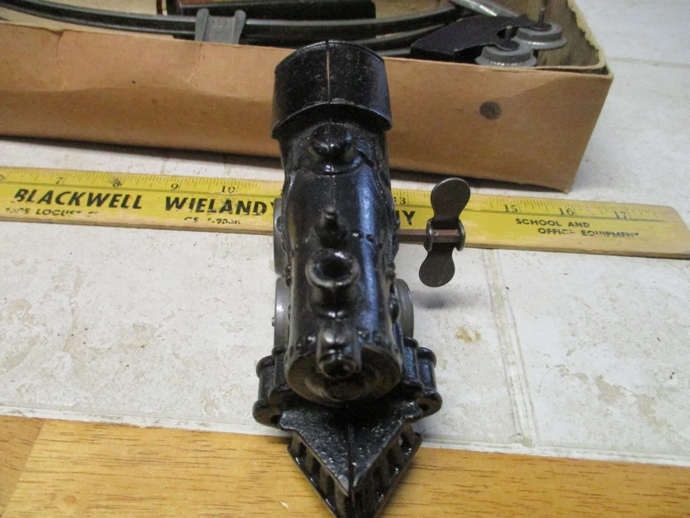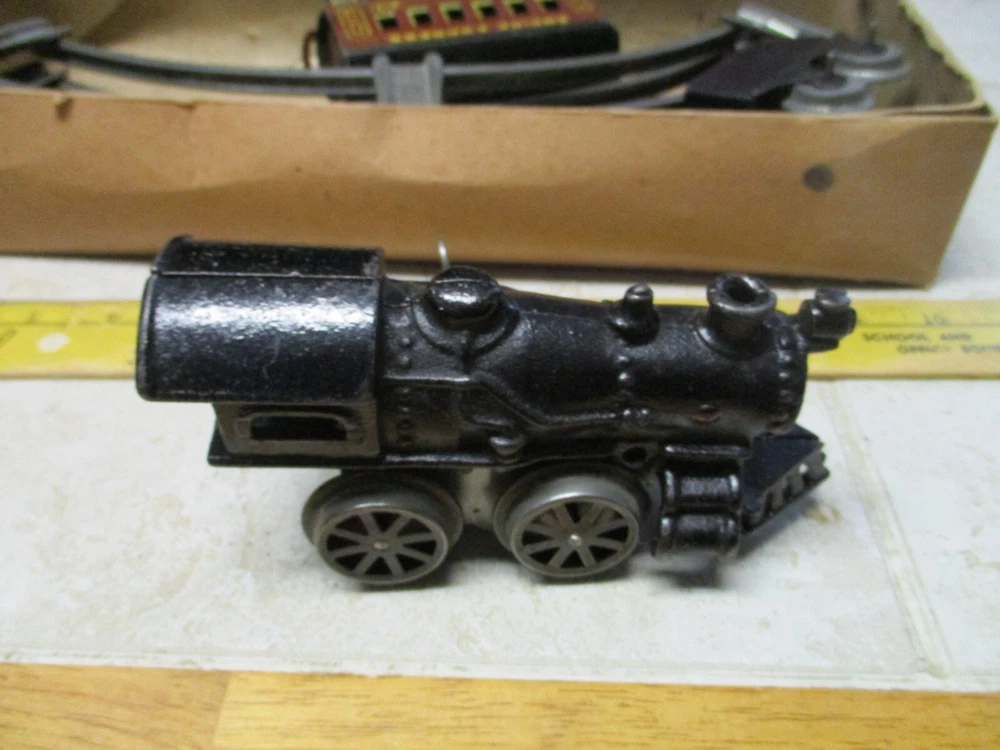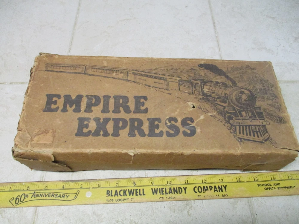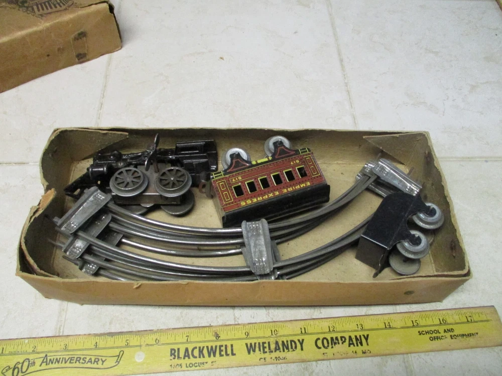 This is a antique american flyer empire express wind up cast iron toy train set american toys. This does wind and work but the box is a little rough.