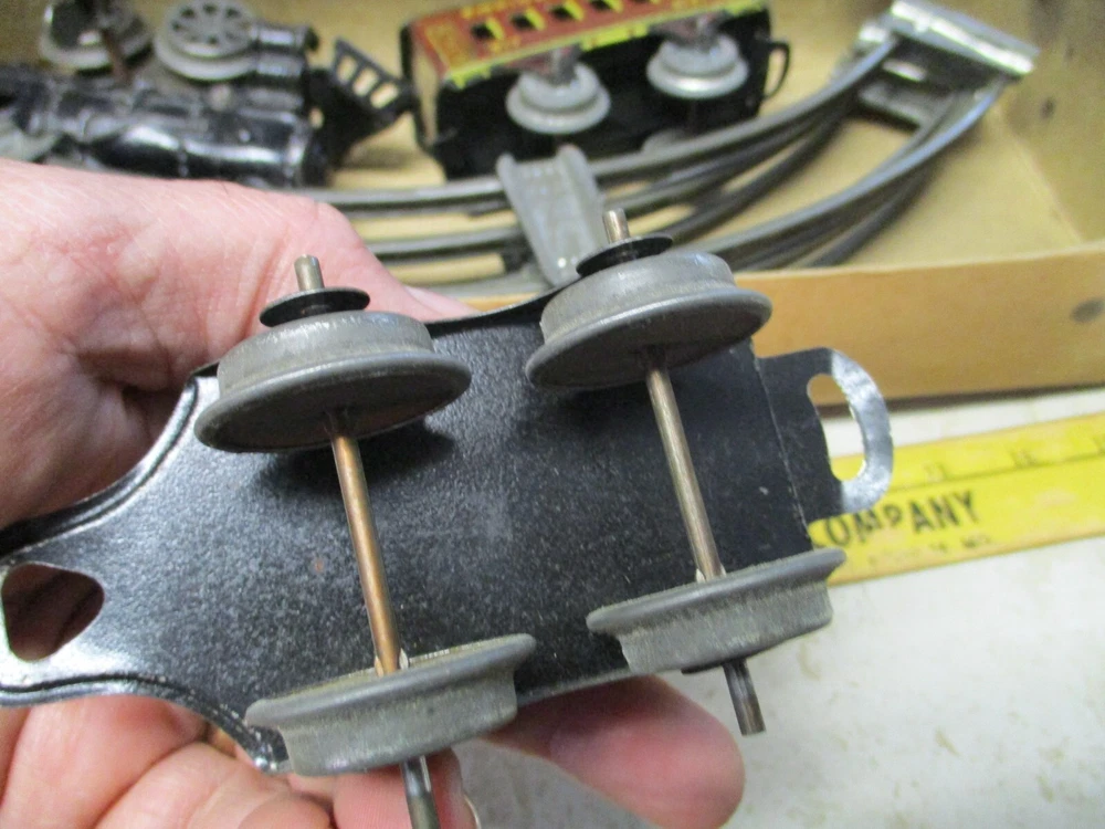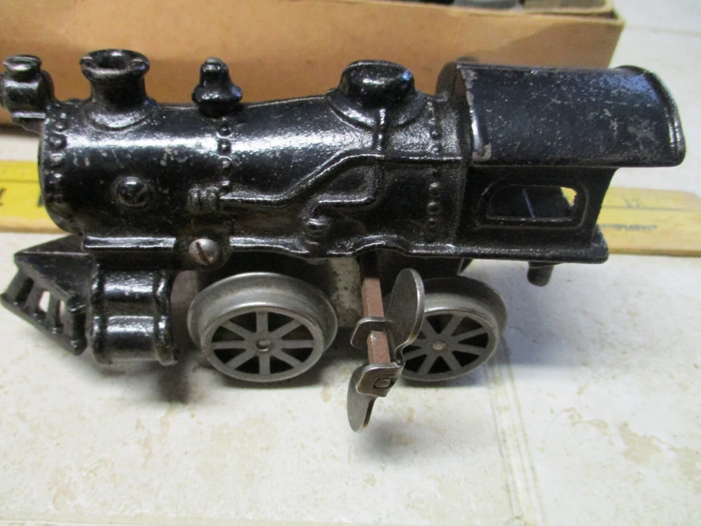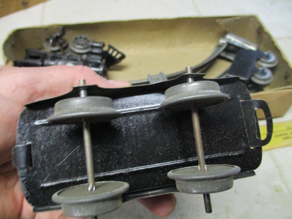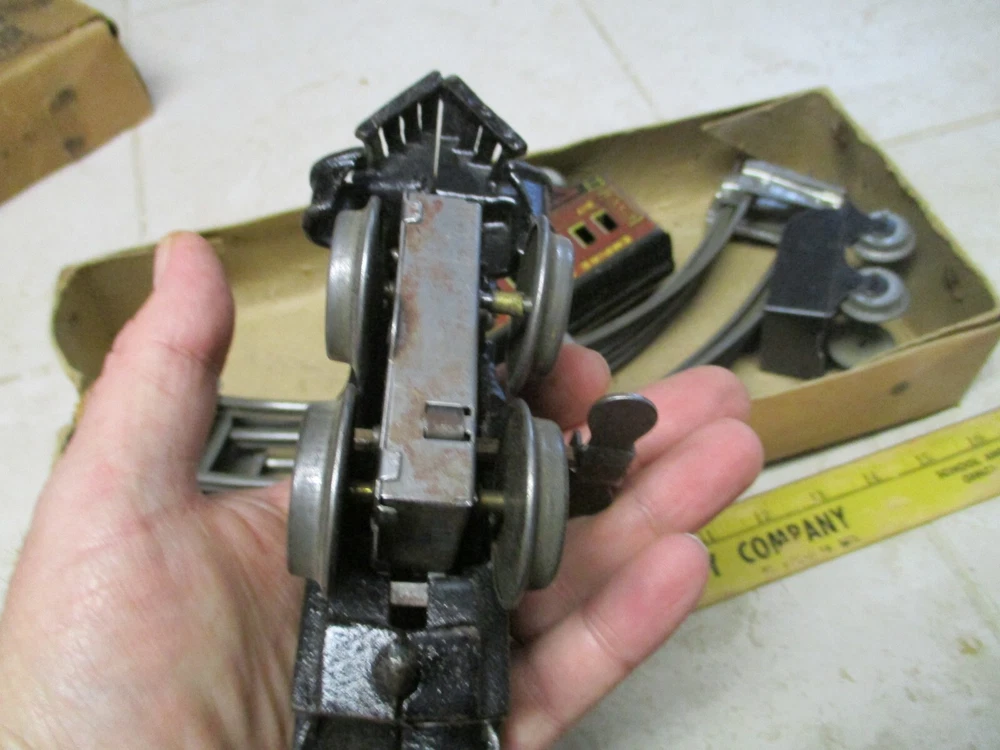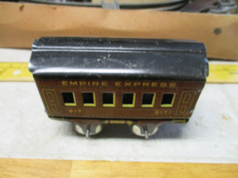 This is a antique american flyer empire express wind up cast iron toy train set american toys. This does wind and work but the box is a little rough.