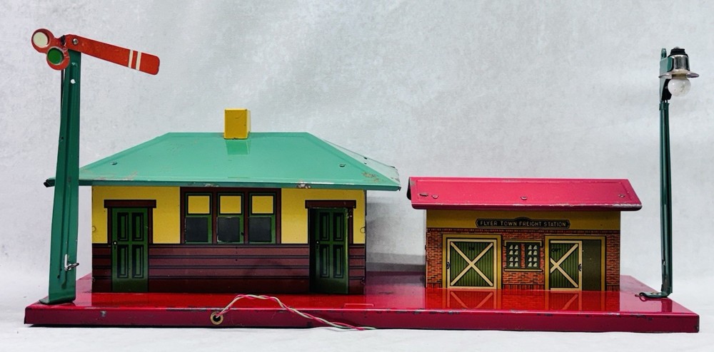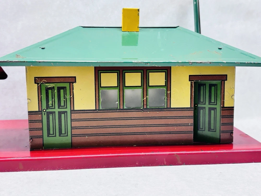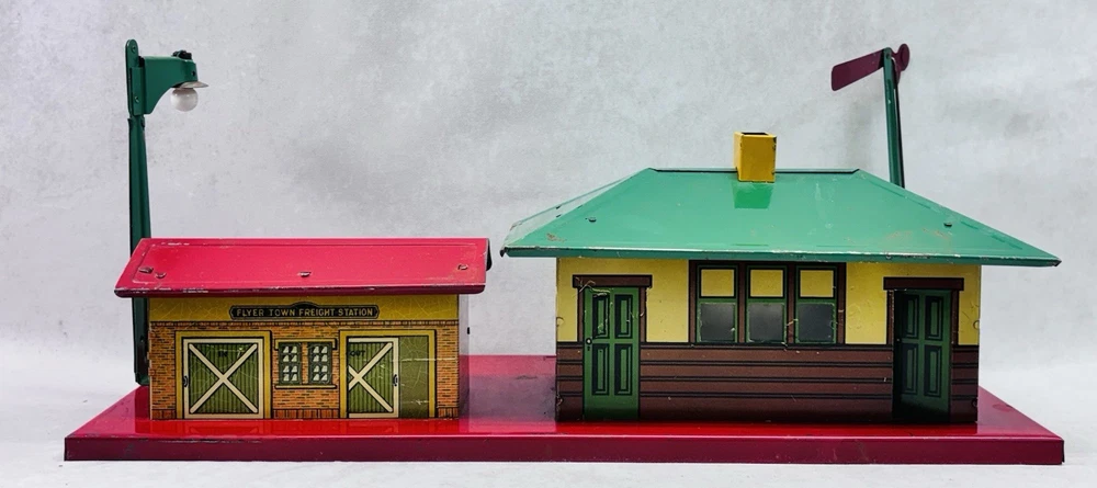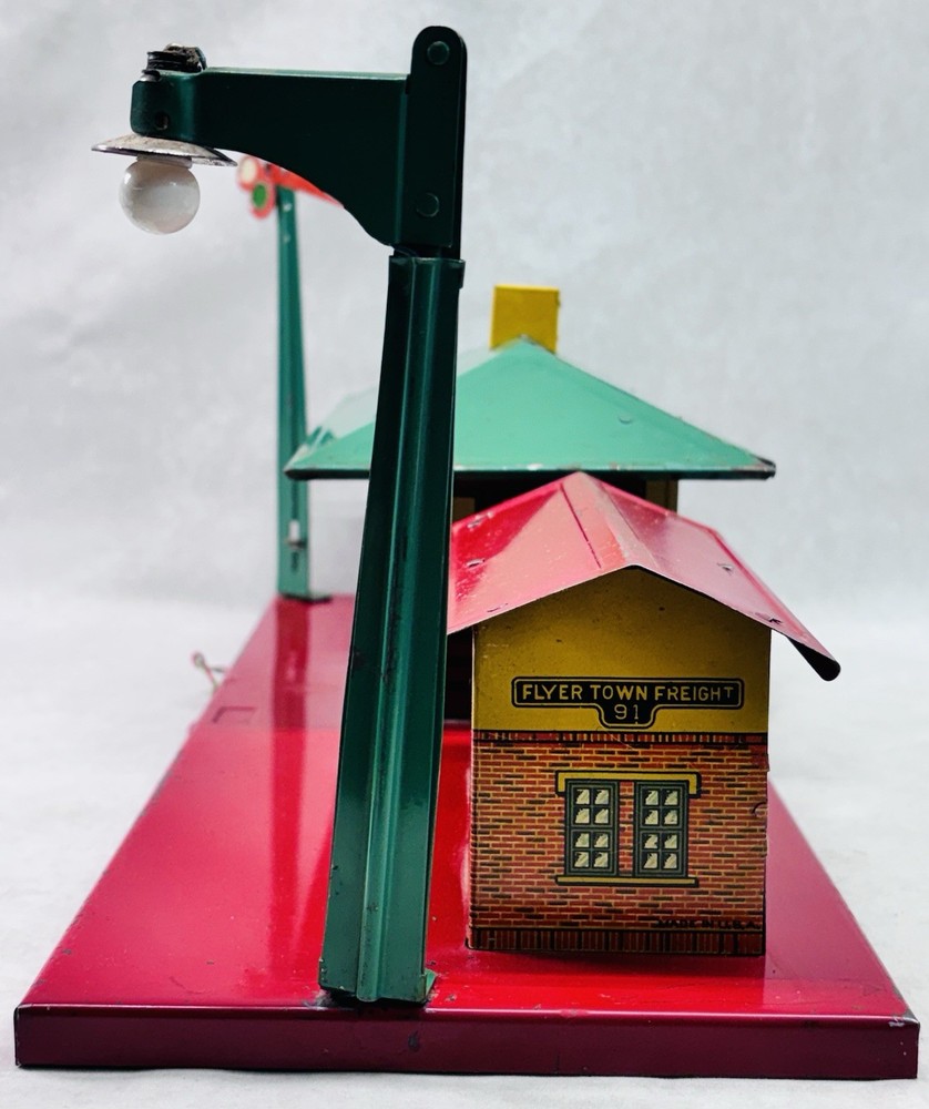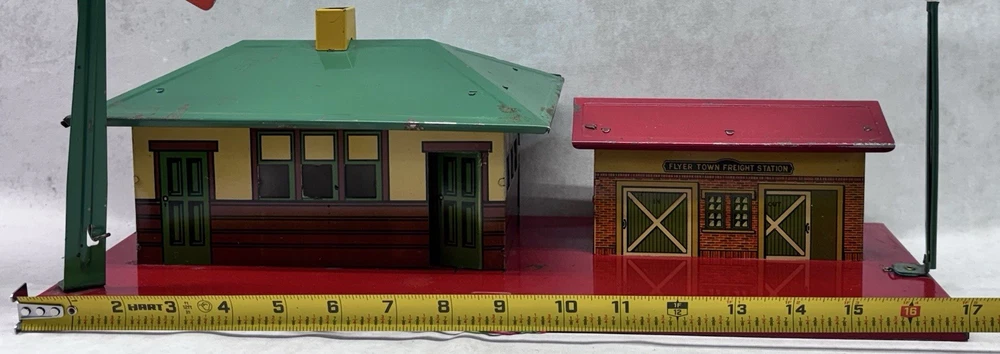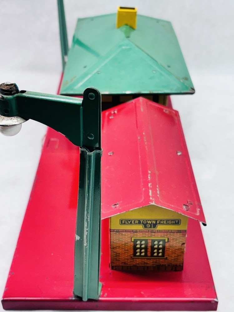 American Flyer O Gauge Tin Freight Station 17” Lighted Vintage Works Vintage American Flyer tin freight station accessory, a classic piece for O gauge train layouts. This larger 17-inch version features the “Flyer Town Freight Station 91” graphic and includes working interior lighting that has been tested and functions as shown. A great display piece or layout addition with strong visual presence. •Brand: American Flyer •Type: Freight station accessory •Gauge: O gauge •Material: Tin litho metal •Width: 17 inches •Height: Approx. 8 inches •Depth: Approx. 6.5 inches •Features: Lighted interior, tested and working •Condition: Shows vintage wear including scratches, paint loss, and age-related marks •Completeness: Appears complete as shown •Notes: Sold as is, please review photos carefully for condition details Nice vintage example with great color and graphics. Displays well and would make a solid addition to any American Flyer O gauge setup or collection. Ships securely.