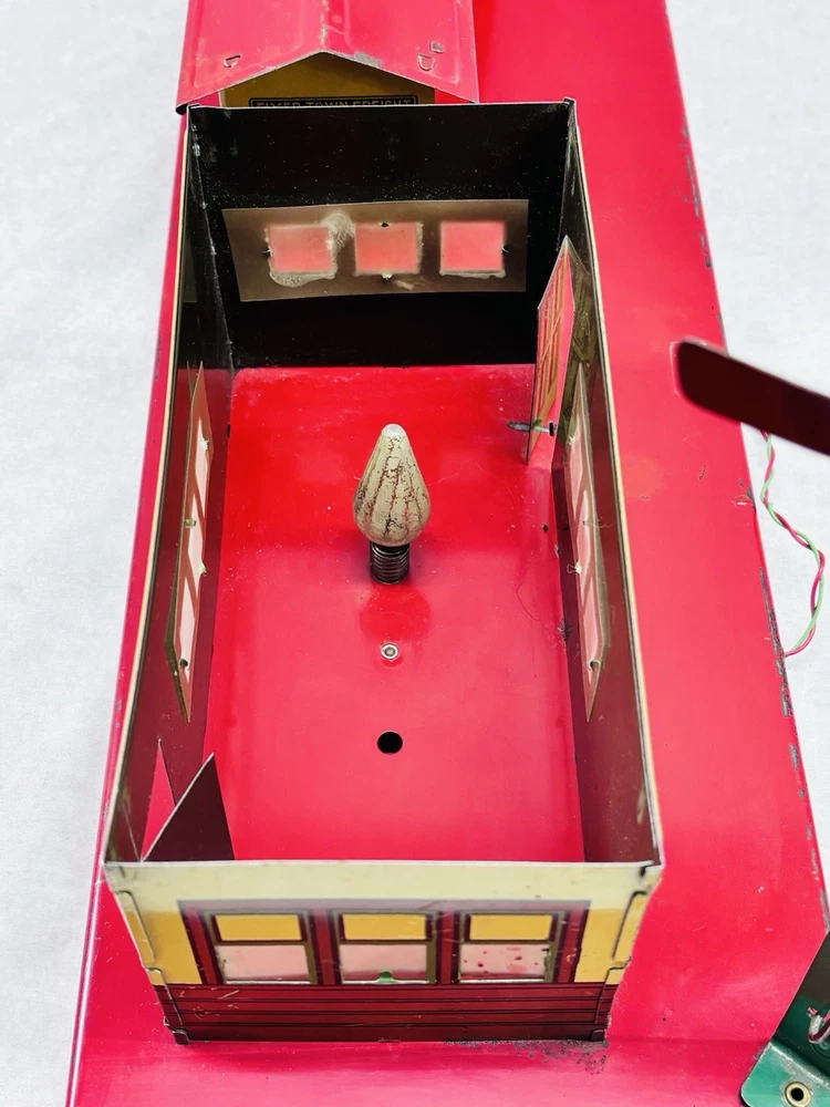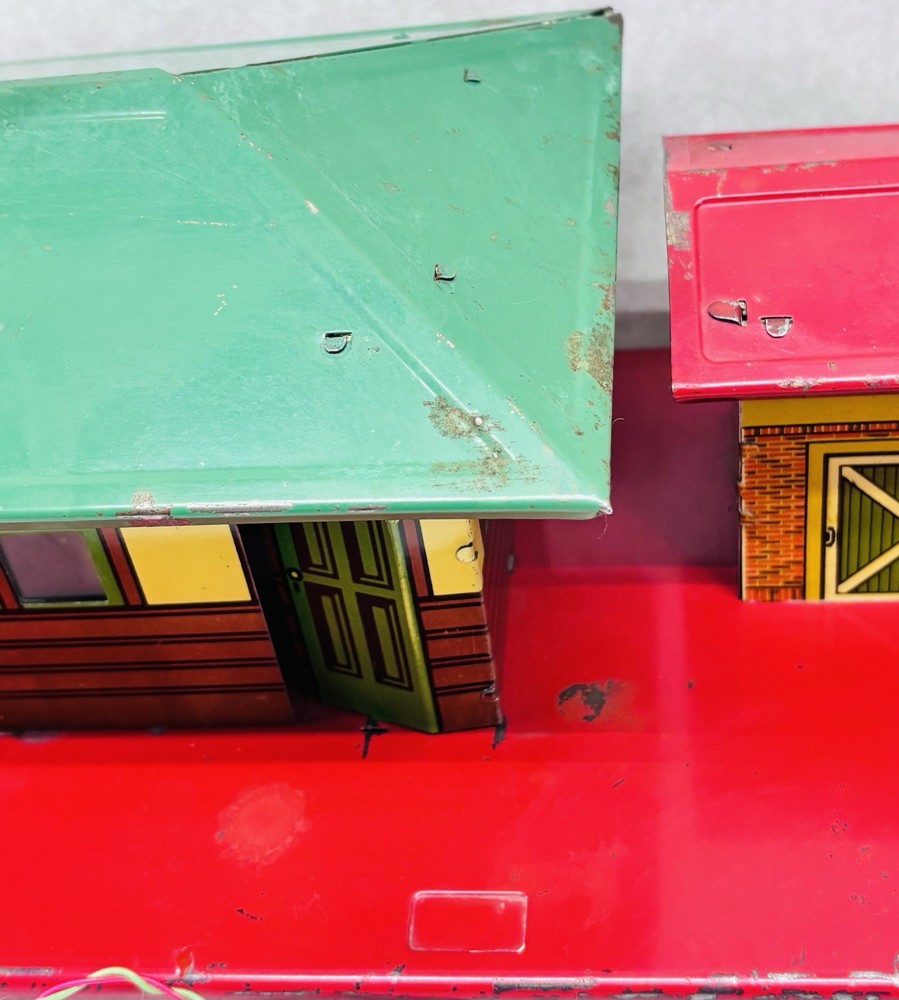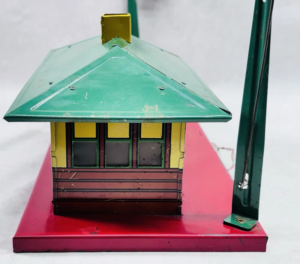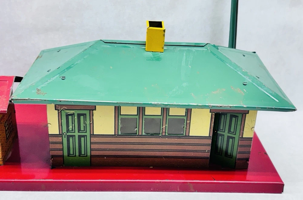 American Flyer O Gauge Tin Freight Station 17” Lighted Vintage Works Vintage American Flyer tin freight station accessory, a classic piece for O gauge train layouts. This larger 17-inch version features the “Flyer Town Freight Station 91” graphic and includes working interior lighting that has been tested and functions as shown. A great display piece or layout addition with strong visual presence. •Brand: American Flyer •Type: Freight station accessory •Gauge: O gauge •Material: Tin litho metal •Width: 17 inches •Height: Approx. 8 inches •Depth: Approx. 6.5 inches •Features: Lighted interior, tested and working •Condition: Shows vintage wear including scratches, paint loss, and age-related marks •Completeness: Appears complete as shown •Notes: Sold as is, please review photos carefully for condition details Nice vintage example with great color and graphics. Displays well and would make a solid addition to any American Flyer O gauge setup or collection. Ships securely.