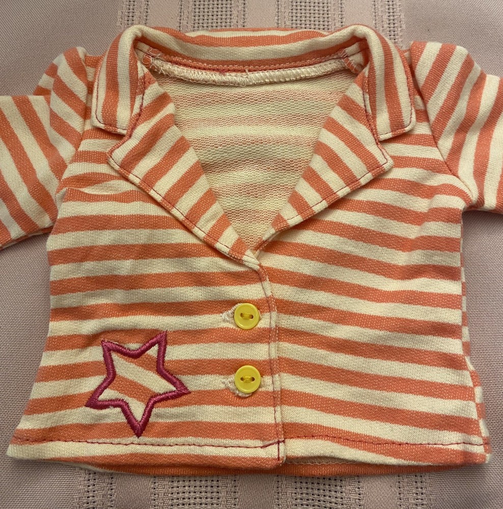 American Girl Bright Stripes Outfit Jacket Only 2014. This jacket is perfect for your 18-inch doll. The jacket is made of cloth and has a bright orange and white pattern with yellow buttons. It is a great addition to any doll's wardrobe and is perfect for playtime. The jacket is part of the Truly Me product line and was manufactured in China. PLEASE SEE LAST PHOTO, as there is a small dark smudge on the back side of the right sleeve.