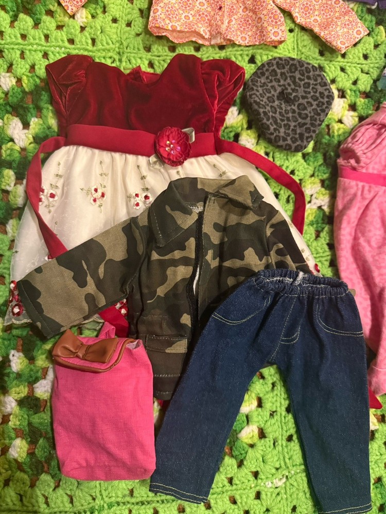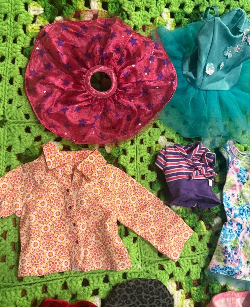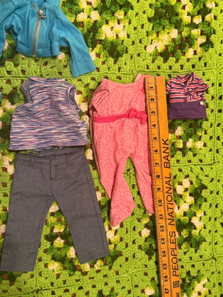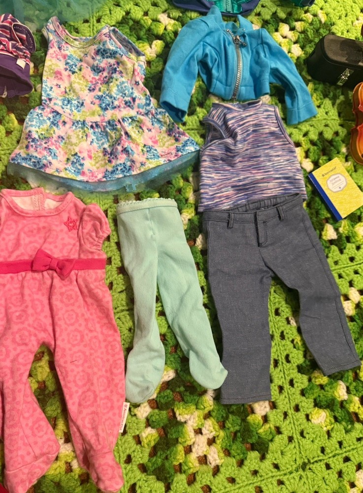 Items are used they may have wear, fade, discoloration, marks, frays or other signs of use. Majority is American girl doll branded, couple pieces are different brands or unbranded. See measurements for sizing reference. Sizes vary Sold as is no returns.