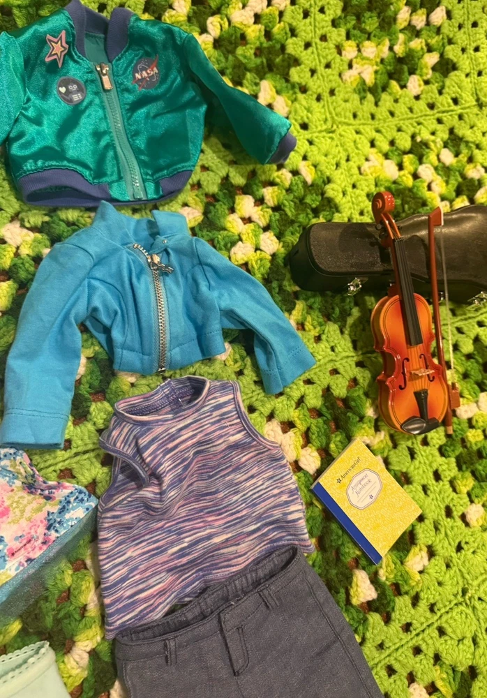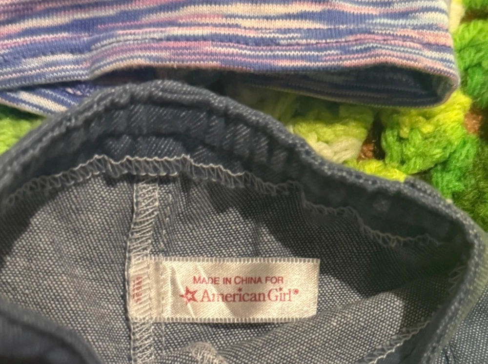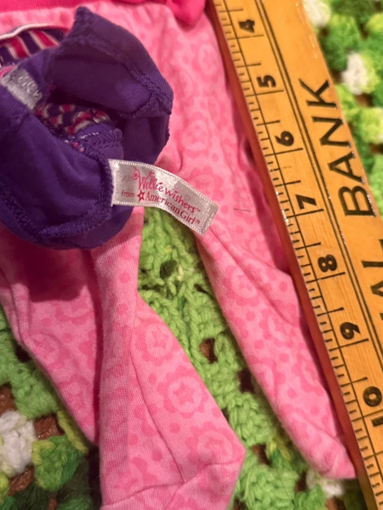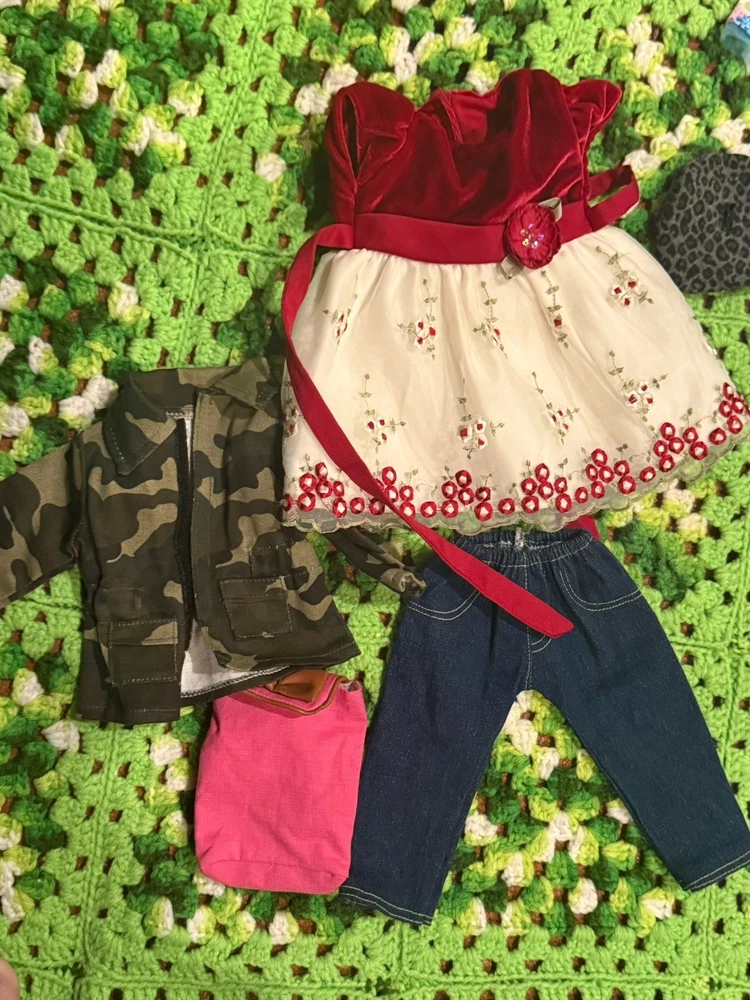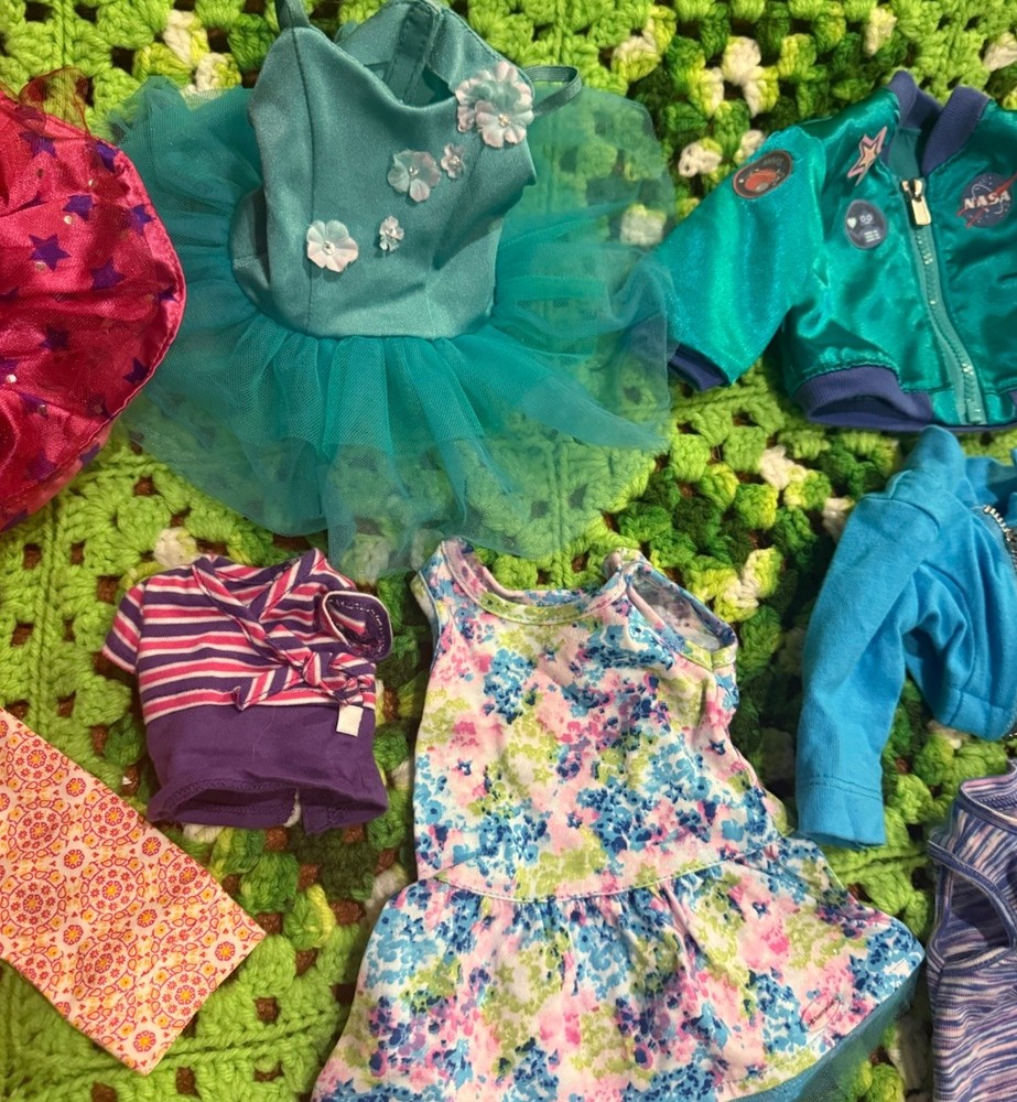 Items are used they may have wear, fade, discoloration, marks, frays or other signs of use. Majority is American girl doll branded, couple pieces are different brands or unbranded. See measurements for sizing reference. Sizes vary Sold as is no returns.