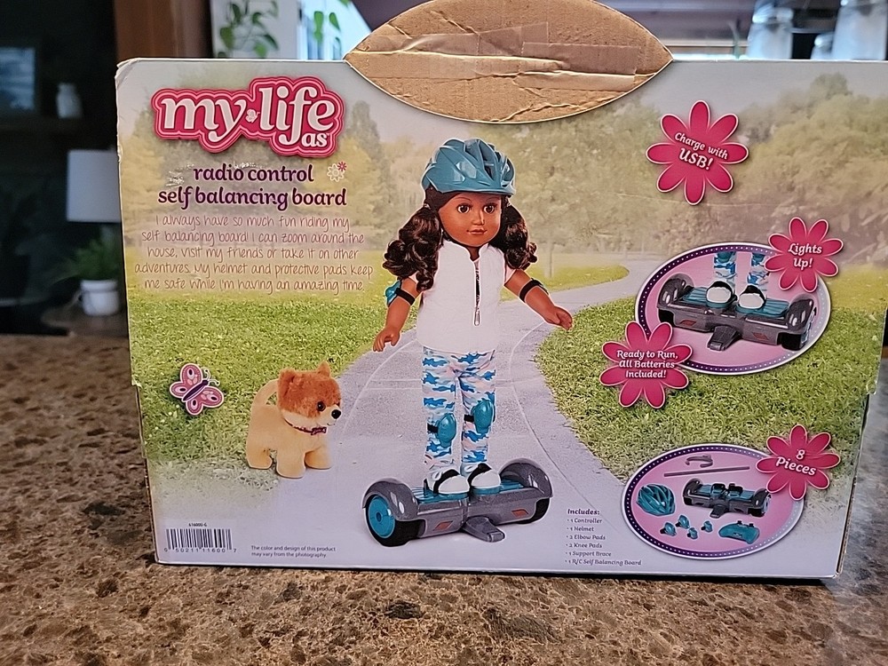 The product is an 18" hoverboard specifically designed for 18" American Girl dolls, part of the My Life As brand. It features interactive and battery-operated functions, making it an exciting accessory for doll play. This unique toy allows kids to transport their dolls around in style, adding a fun and modern element to imaginative play scenarios. Made of plastic and measuring 18 inches in width, this hoverboard is a part of a set that includes the transporter and is suitable for various age levels, from toddlers to teens. Perfect for young American Girl enthusiasts looking to expand their playtime with interactive accessories.