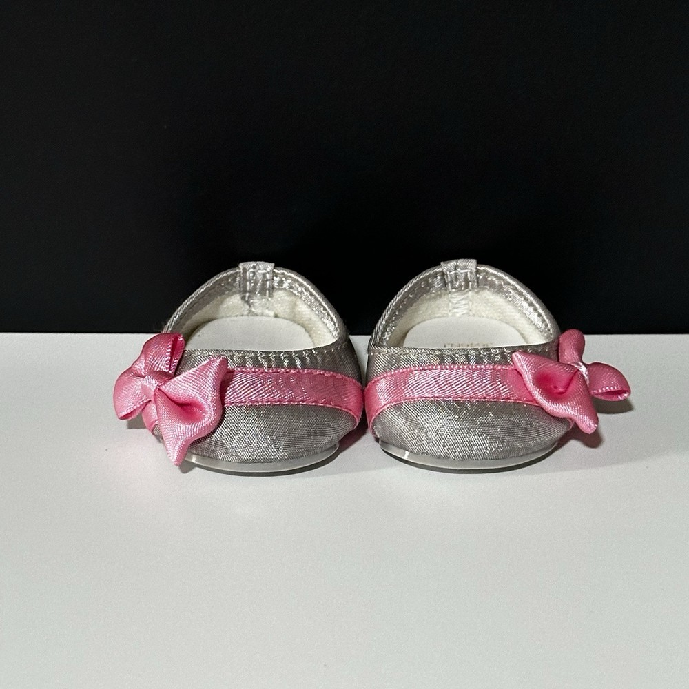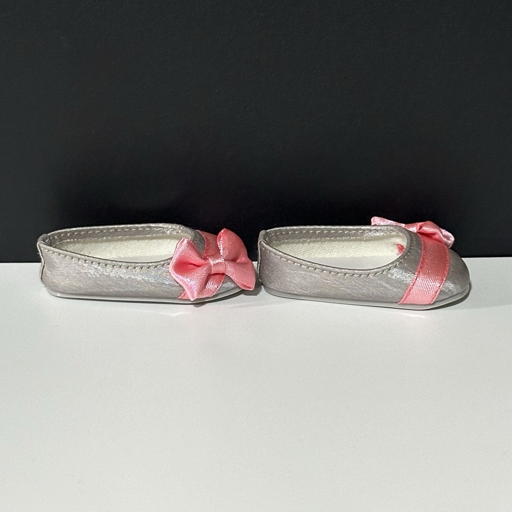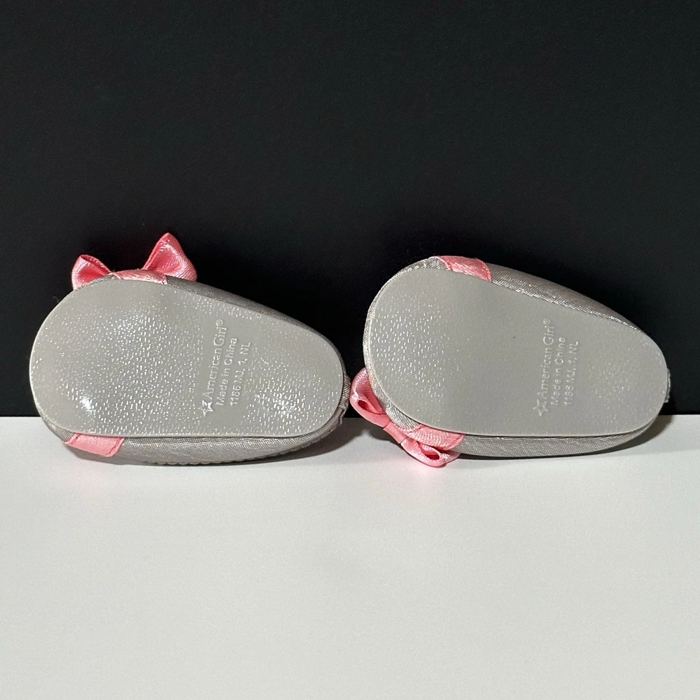 These silver flats are part of the Twirly Tiered Dress for the Bitty Baby American Girl dolls. From the 2014 Bitty Baby line. The flats have a pink ribbon across the top and a bow on the outside of the each shoe. The shoes are in great played in condition with normal signs of wear from use and time. Please review all photos for condition and ask any questions as this is sold as is. To ensure satisfaction with your items, I photograph and record the entire packing process. Returns will only be accepted if the item is returned in the same condition it was sold. Thank you for your time! :)