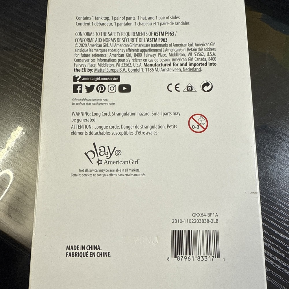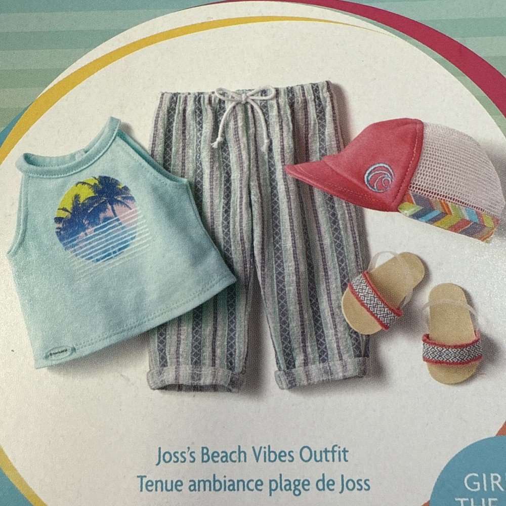 Dive into the summer fun with the American Girl Joss Beach Vibes Outfit, a perfect addition to your doll's wardrobe. This casual ensemble features a top that captures the playful essence of sunny days and relaxed vibes. Designed exclusively for the GotY 2020 doll, Joss, this outfit is ideal for those who love creating stories and making memories. The outfit set includes all the essentials for a day at the beach—pants that are comfortable for playtime and a hat that complements the sun-soaked adventures. Crafted with care and detailed attention, this original clothing set is not just about style but also about encouraging imaginative play.