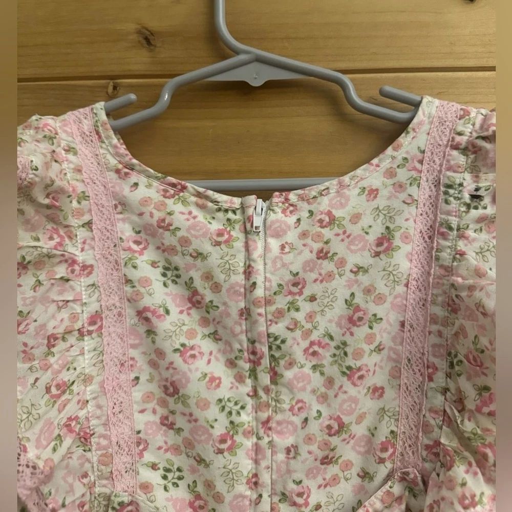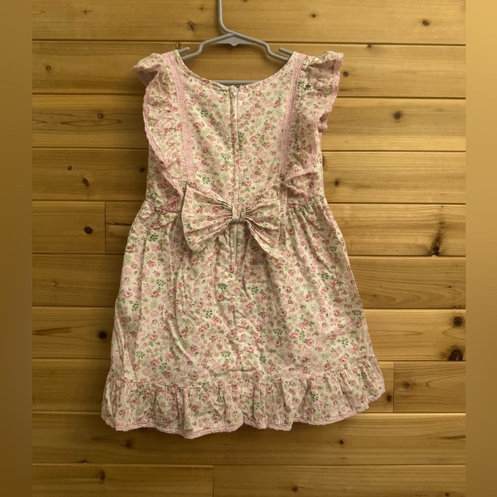 Pink Floral Print Ruffle Short Sleeve Cotton Dress With Bow Details On Back & Zipper Closure Materials: 100% Cotton Measurements In Inches: Pit To Pit: 12 Length: 22
