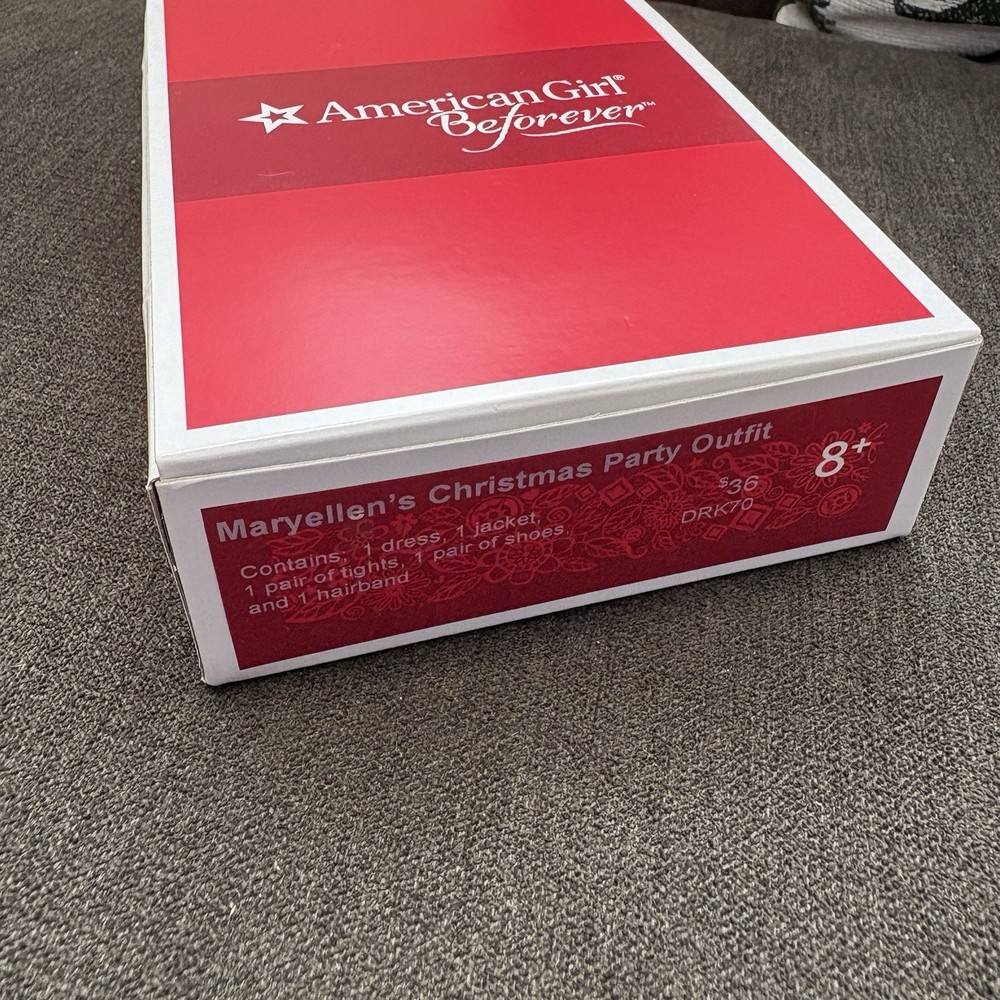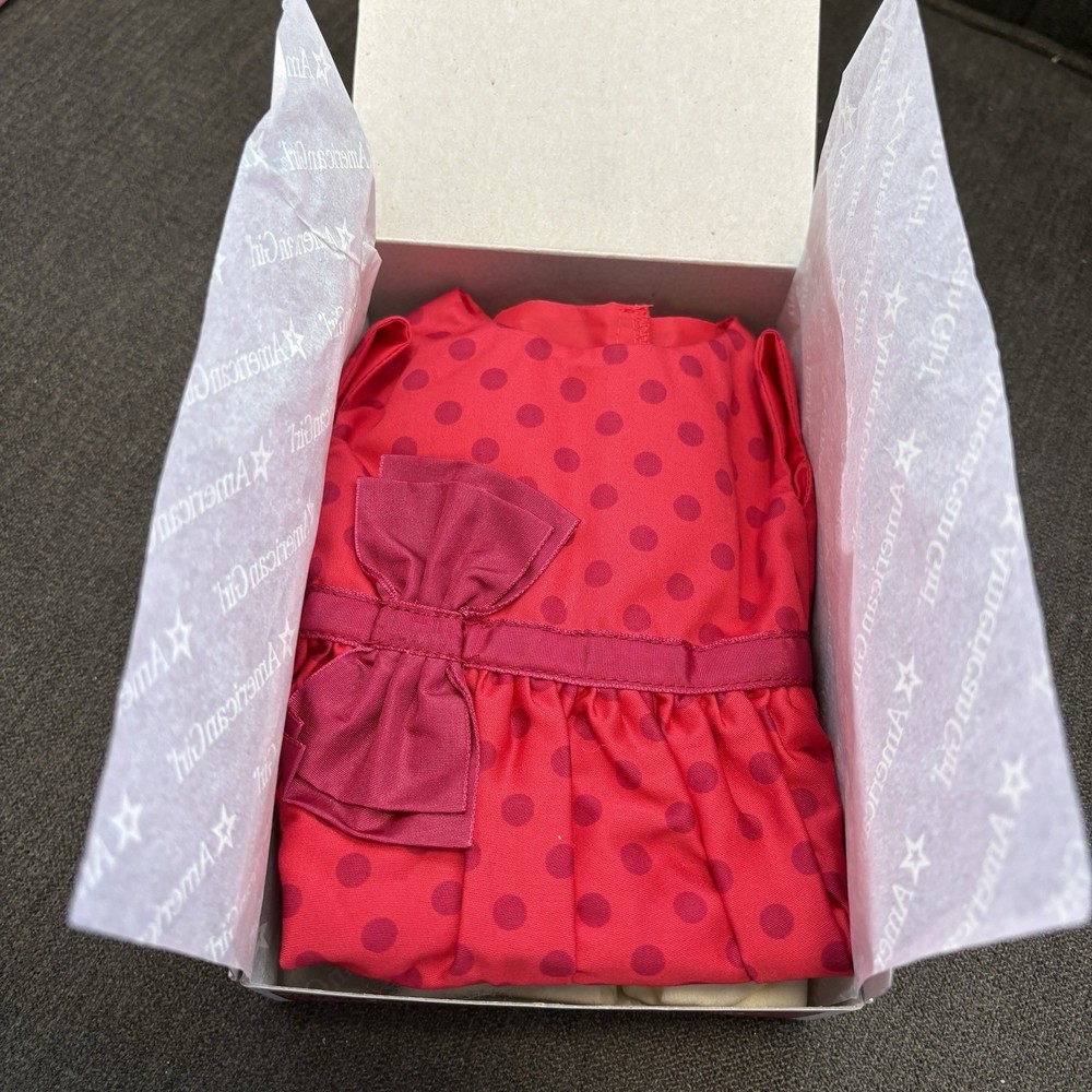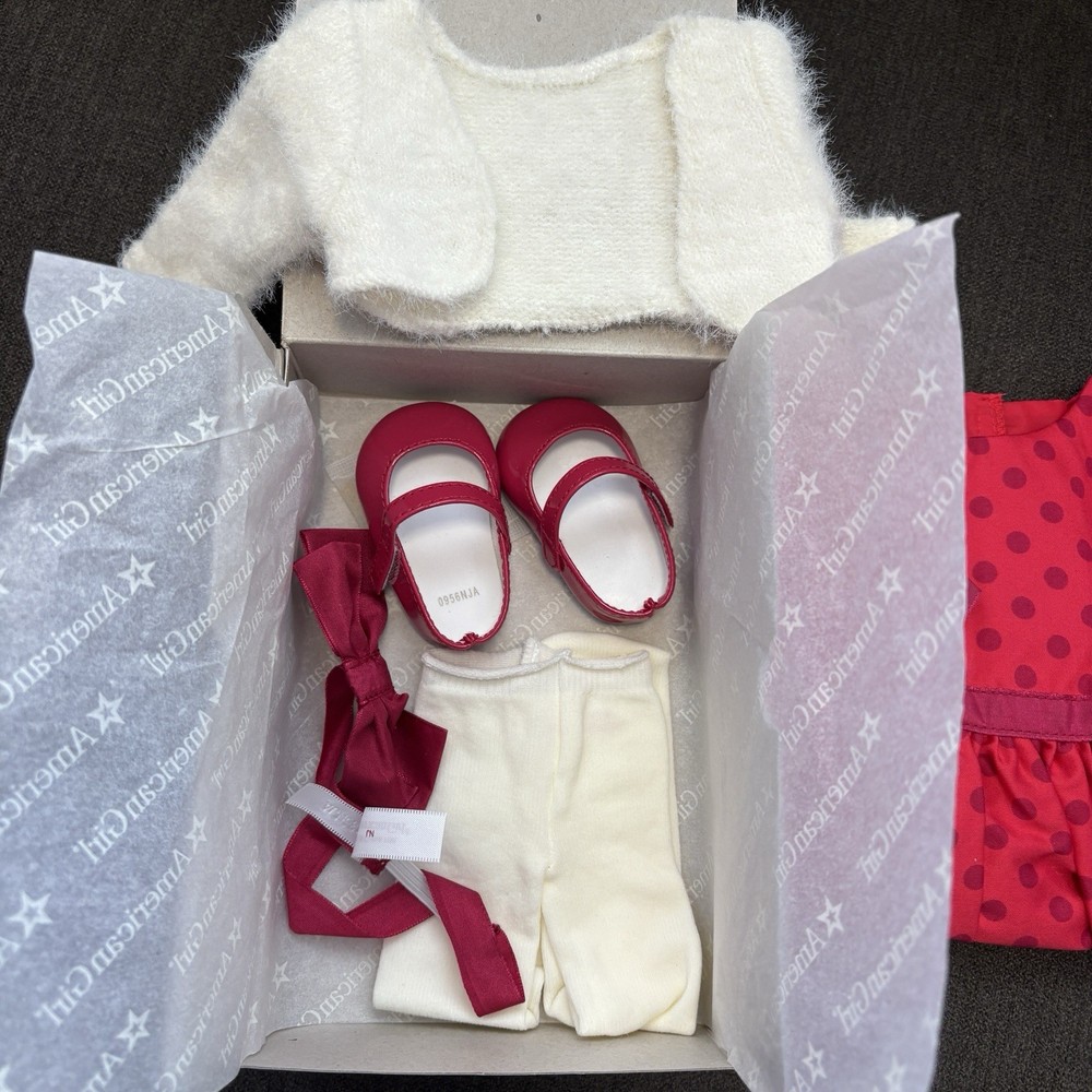 NEW IN BOX, from an adult collector, one owner, pet-free, smoke-free home. Includes red polka dot dress, red Mary-Jane shoes, hair bow headband, tights, and white fuzzy shrug bolero jacket. All in original BeForever packaging.