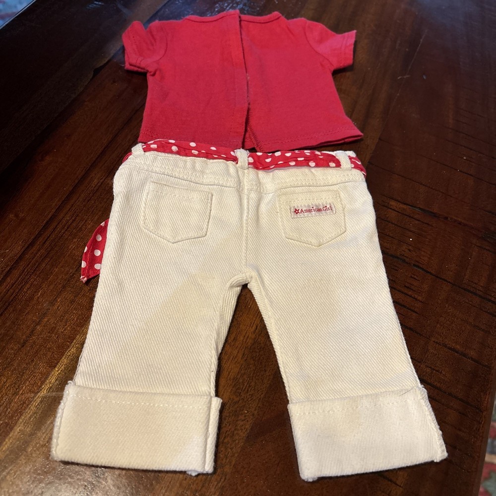 Dress your American Girl doll in style with this exclusive Scarf Capris Tees Mix & Match set, available only at the American Girl Place Store. This outfit is tailored for dolls with an 18-inch size, and it's perfect for those who love to mix and match to create unique looks. The set includes a charming red top and pants, allowing your doll to showcase a vibrant and playful wardrobe. Crafted with care by the renowned brand American Girl, this clothing set is designed to fit girl dolls of various types, including play dolls. The high-quality materials and attention to detail ensure that the clothes are both durable and delightful. Whether it's for a special occasion or for everyday fun, this set promises to add a touch of whimsy to your doll's collection.