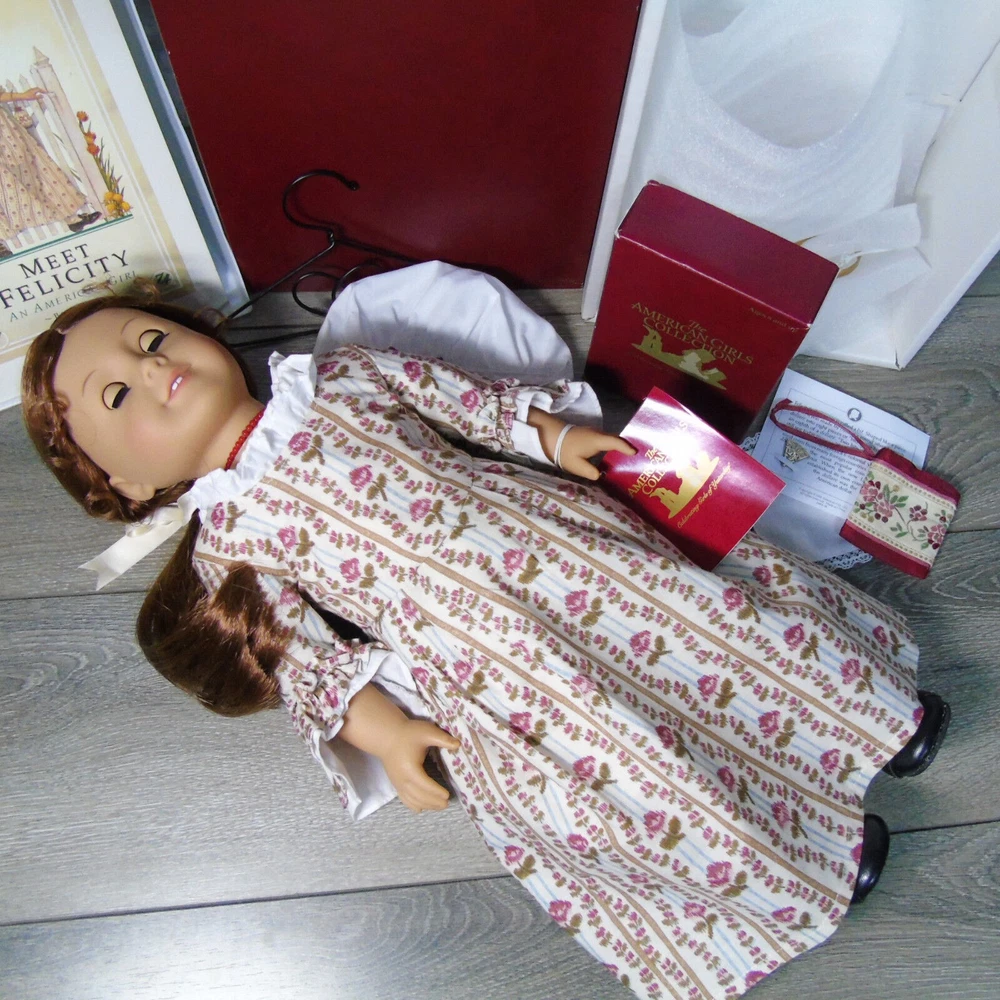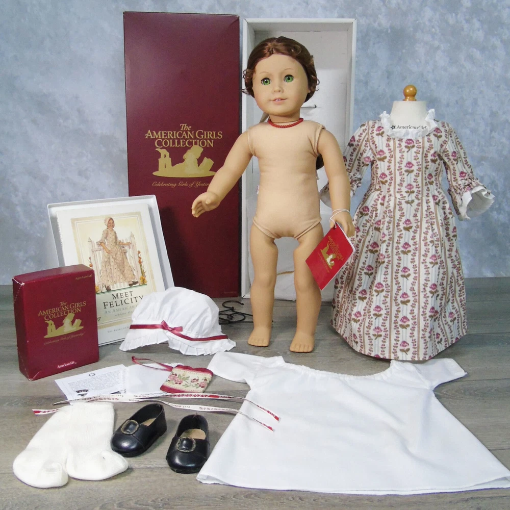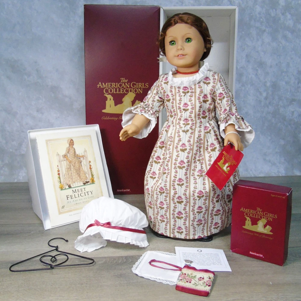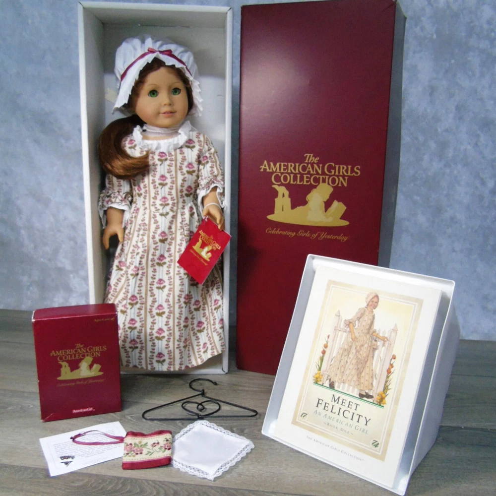 You Are Looking To Buy: American Girl DOLL 18" FELICITY MERRIMAN In Original MEET OUTFIT With ACCESSORIES. Red Hair Green Eyed Doll In American Girl Box by Pleasant Company With Meet Accessories In Box And 'Meet Felicity' BOOK! Who she is: Felicity Merriman Was The Fourth (4th) Historical Character Of The American Girl Dolls Representing The Revolutionary War Period! Felicity Was Released In Fall 1991. Felicity Was Officially Archived On March 28, 2011 And Re-released In 2007 For BeForever Collection! Light Skin, Green Eyes, Red Hair With Pin Curls On Sides! Felicity's Meet Outfit Has Had 3 Distinct Differ •The First (1st) - As Is With This Set - Is The Pleasant Company Label Dated From 1991-2005 A Cream Flower Striped "Rose Garden' Gown, White Shift Undergarment, Off-White Stockings, Black Shoes With Brass Buckle And Ivory Satin Hair Ribbon. Also Included In This Set Is Felicity's Original Meet Accessories In Box- Coral Necklace, Round-Ear Cap, Garters, Coin Bit, Handkerchief, And Drawstring Purse! •The Second Meet Outfit Was Felicity's Purple Travel Gown With Embroidered Flowers & Mop Cap, Knit White Socks And Black Shoes With Brass Buckles •The Third Meet Outfit Is Felicity's BeForever Meet Outfit - A Blue & Yellow Brocade Gown. Silk Brocade With Flowers, Vines And Buds Woven In Various Red and Yellows. With A Petticoat Panel Of Yellow Cotton With Diamond 'Quilting' In Gold, White Stockings and Brown Colonial Shoes With Gold Brass Buckles! •Felicity (nicknamed Lissie) is a tomboyish, daring, adventurous, spunky, brave, and fiercely independent-minded girl. She is very active for a girl her age in her era and is annoyed at her lack of freedom as a young girl and the ladylike things and personality that is expected of her. Felicity believes in fighting for what she wants and can be quite stubborn and headstrong at times; this gives her a strong connection to Benjamin Davidson. When she wants something, she goes for it, quite often without thinking about it. She sometimes wavers between brave and foolish and sets her heart on things often. When Felicity is angry, she's never afraid to speak her mind and stand up to bullies, as she did with Jiggy Nye. Felicity also isn't afraid to tease Annabelle, coming up with the name "Bananabelle". Felicity is good with coming up with names. She came up with Polly's, Posie's name, Penny's, and Patriot. •Felicity learned to ride and make friends with horses at Grandfather's Plantation; this aids her in taming Penny, but is a hindrance when it gives her overconfidence in Felicity Takes A Dare. •She is constantly fussed at for being not very ladylike. For the most part Felicity is a "tomboy" with a love for horses, nature, and the great outdoors. She is quite impatient—especially when it comes to things she finds dull and boring—and is often regarded as "flighty" and "thoughtless" by her mother and often chided for not finishing or tending to her domestic work properly. She shows disinterest for the most part in cooking, sewing, dance, and other then-feminine skills, though she does like working in her garden and playing her guitar, which was considered feminine then. Sewing especially bores her and she is generally sloppy in her work. Felicity loves horses more than anything, hence her affection for Penny that is carried throughout the series and her dedicated care towards her from the start. She eventually learns how to be more of a lady throughout the series with events such as dancing at a fancy dancing lesson designed as a ball, and learning how to serve tea; however, she is still quite active. •Felicity enjoys working in her father's store, where she can imagine where all the items come from. She tends to act more like a fine lady at the store. •Felicity enjoys making her best friend Elizabeth laugh. •American Girl characterizes her as "spunky" and "spritely." Americangirlpublishing.com describes her as "independent", "loyal", and "spirited". American Girl e-card describes her as steadfast. •This Pleasant Company Felicity Doll Arrives In Her Original Burgundy Box With Wrist Tag & Accessories In Box. Felicity Will Be Dressed In Her Original Pleasant Company Meet Outfit Dress, Shift Undergarment With Somewht Loose Elastic At Neck, Stockings, Garters, Black Shoes With Buckle Coral Necklace & Bonnet Cap. Included In Her Boxed Accessories Is A Drawstring Purse, Colonial Bit Coin & Handkerchief! A Paperback "Meet Felicity" Book Accompanies Felicity (Dress Mannequin Sold Separately) •Size: 18" Full Size American Girl Doll •Excellent Condition In Box With Boxed Accessories - From Adult Collector. Great Gift for Him or Her - or For Yourself! Buy In Confidence From 100% Positive Feedback Seller Thank You! We will ship your order immediately upon receipt of payment. For your convenience, we do combine shipping and often discounts on multiple item orders to same address. Please Come Back To Shop And Buy Again!