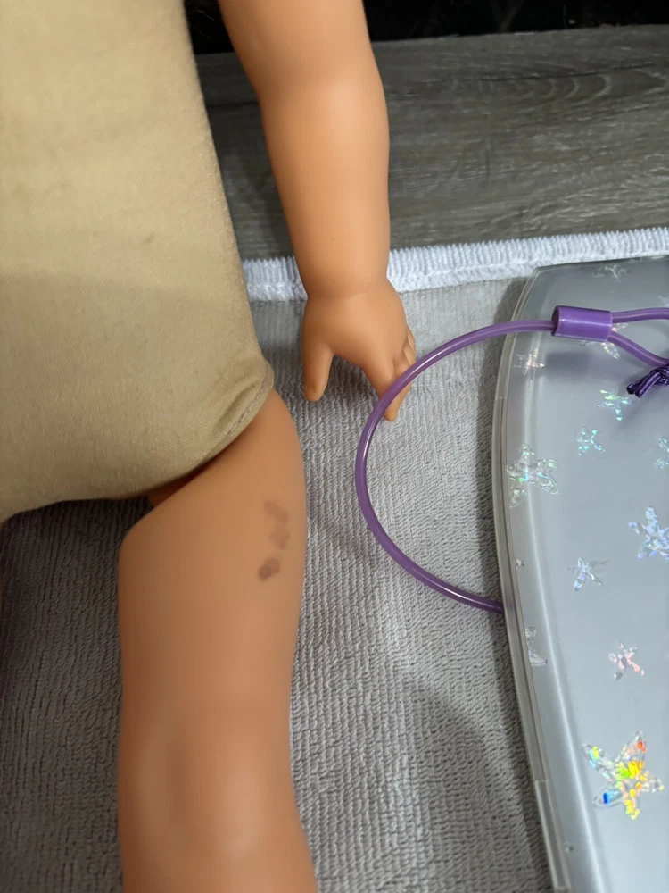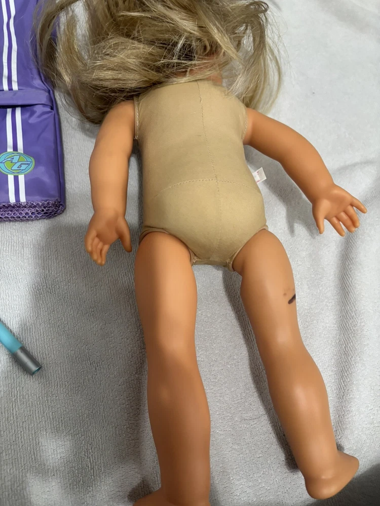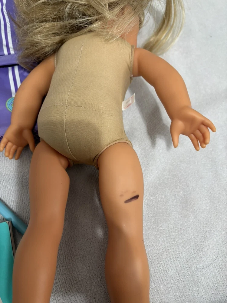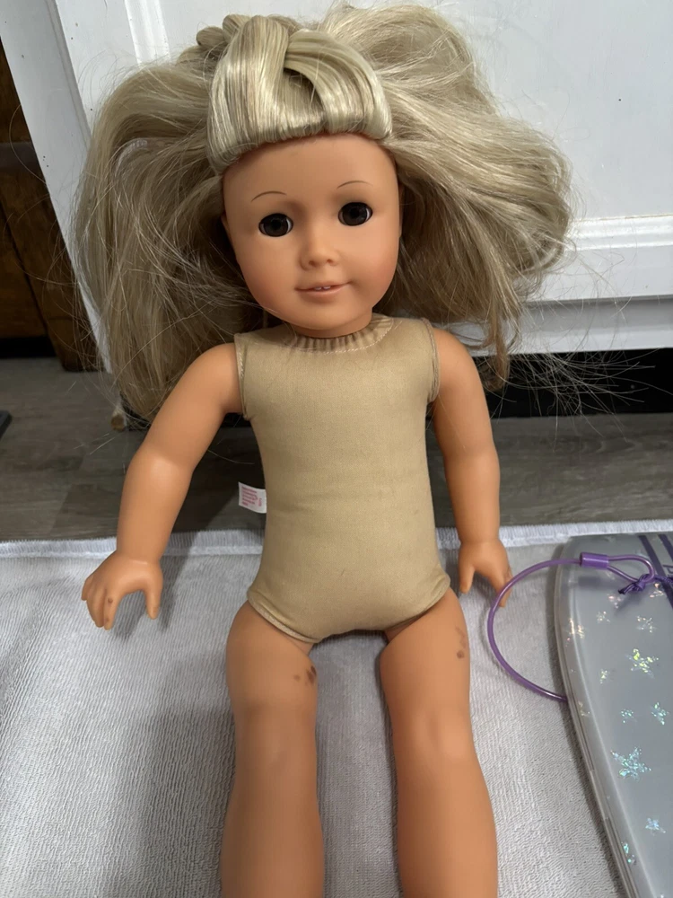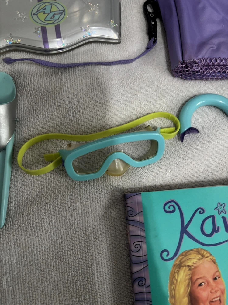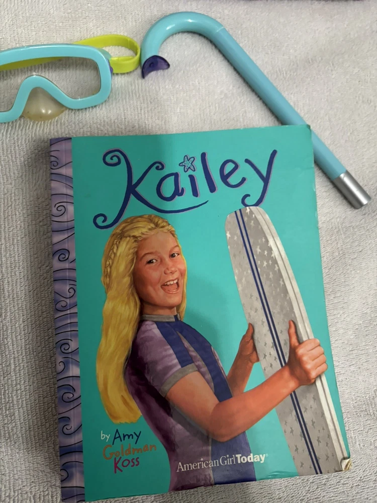 American Girl/Pleasant Company 2003 Kaylie. Retired. Many accessories but not inclusive to original. Kaylie has marks on her legs please see pictures. Accessories according to pictures for condition. Surf board, surf board carrying case. Dress, swim outfit, with swim shoes, goggles , tube and flappers. Original book. Original Owner.