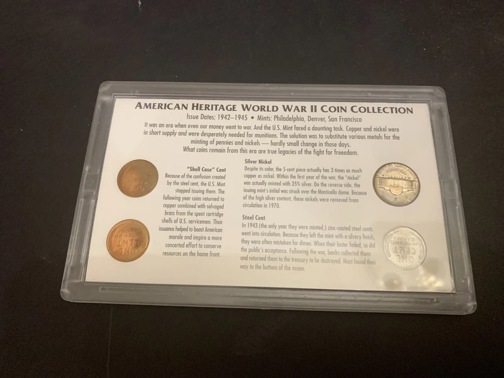 ITEM: American Heritage World War II Coin Collection DESCRIPTION: This is a American Heritage World War II Coin Collection . Nice Find! This has a steel cent, 2 copper cents, and a nickel . The size is approximately 6 3/4 inches by 4 1/4 inches tall . CONDITION: This in in Good condition with some darkening to the patina . The pictures are part of the description, so please view all pictures. This is being sold as shown, so if you have any questions please contact us. NOTE: The post office goes by size and weight and location, I ship Priority mail unless otherwise stated. If a Parcel post option is listed as a shipping option (sometimes it is due to weight or size or a combination of both) please be aware that this is for a one way ticket from the Post Office--if it is returned for any reason I have to pay to pick it up and pay to reship it to you-- Parcel Post can take up to 9 days to get to you, if you are buying a book and choose Media Mail this could take up to 9 days to get to you so please keep this in mind. Even though I ship within 1 business day, these forms of shipping take longer. If you are an International Buyer and choose a First Class International Shipping Option Be Aware There is No Tracking Number And Items Do Get Lost. You Will Be Responsible If The Item Is Lost, I recommend shipping via International Priority Mail so you have a tracking number!! I always ship within one business day. If you want the item very quickly then pay for the item by 7 pm Monday through Friday then the item will be at my local post office on its way to you at 7 am the next day. If you pay after 7 pm Monday through Friday nights, I will ship the item out the second business day. For example, if you pay for an item at 7:05 pm on Monday night, it will be taken to my local post office at 7 am on Wednesday. I do ship out on Saturday too. If you pay via an e-check it will not ship until payment clears through Paypal which can take from 5-10 days. I only accept returns if the item is not as I described it. All pricing is up front so you know exactly how much everything is! CONTACT: If you have any questions, comments, or concerns please use eBay messages. PAYMENT : PAYPAL PREFERRED Payment is expected within 4 days of completed auction. International Buyers – Please Note: • Import duties, taxes, and charges are not included in the item price or shipping charges. These charges are the buyer's responsibility. • Please check with your country's customs office to determine what these additional costs will be prior to bidding/buying. • These charges are normally collected by the delivering freight (shipping) company or when you pick the item up – do not confuse them for additional shipping charges. • We do not mark merchandise values below value or mark items as "gifts" - the US and International government regulations prohibit such behavior. RETURN POLICY: I only accept returns if the item is grossly misrepresented. The return shipping is the buyer's responsibility. SHIPPING & HANDLING: The post office goes by size and weight and location, I ship Priority mail unless otherwise stated. There is no handling charge passed on to buyers. You are paying for the cost of the shipping only. The cost of the supplies used to ship your item is being paid by me. COMBINED SHIPPING: I offer combined shipping on all items of similar size and weight. However, if you purchase an extremely large and fragile piece, I will NOT ship that with other large and fragile pieces. INTERNATIONAL SHIPPING: The post office goes by size and weight and location, I ship Priority mail unless otherwise stated. There is no handling charge passed on to buyers. You are paying for the cost of the shipping only. The cost of the supplies used to ship your item is being paid by me. Mary03---JJ