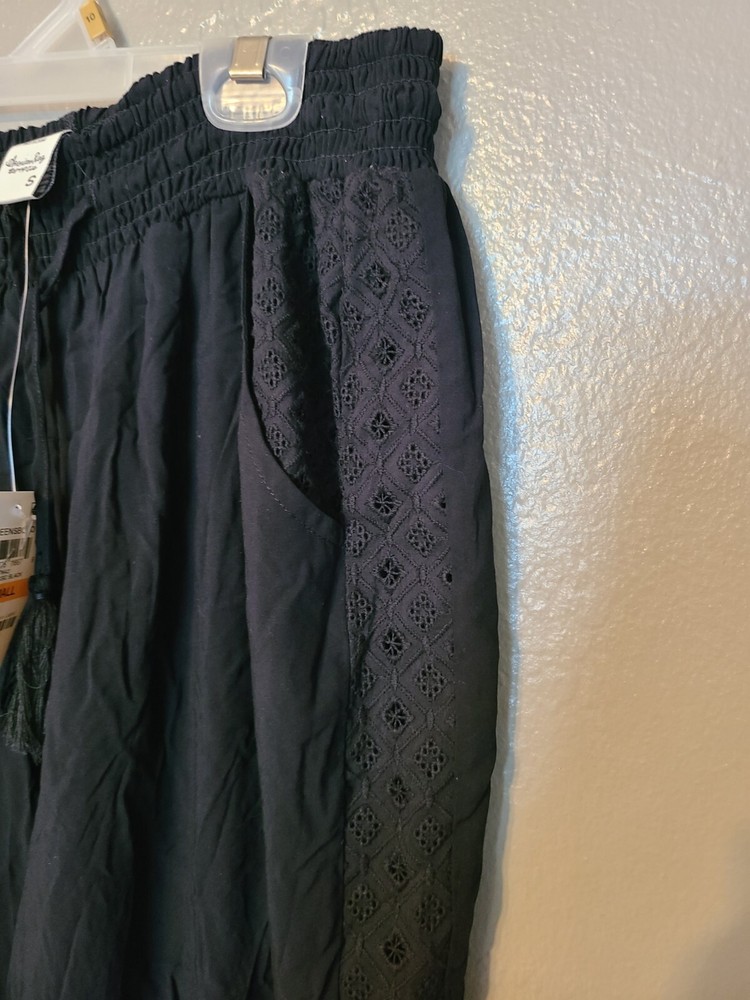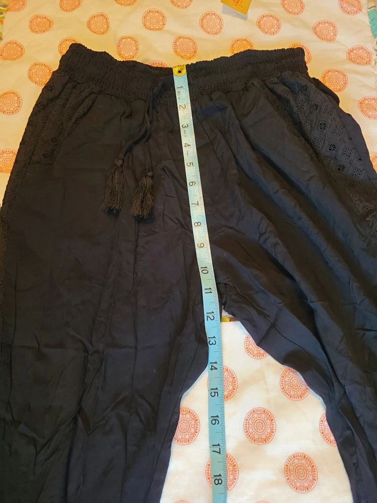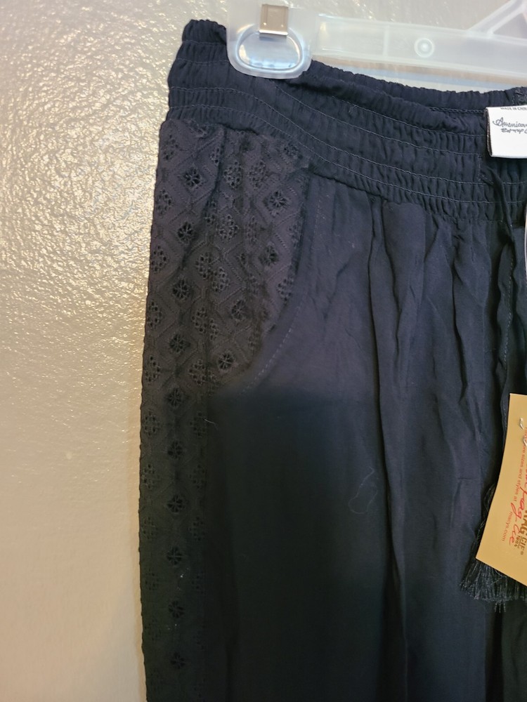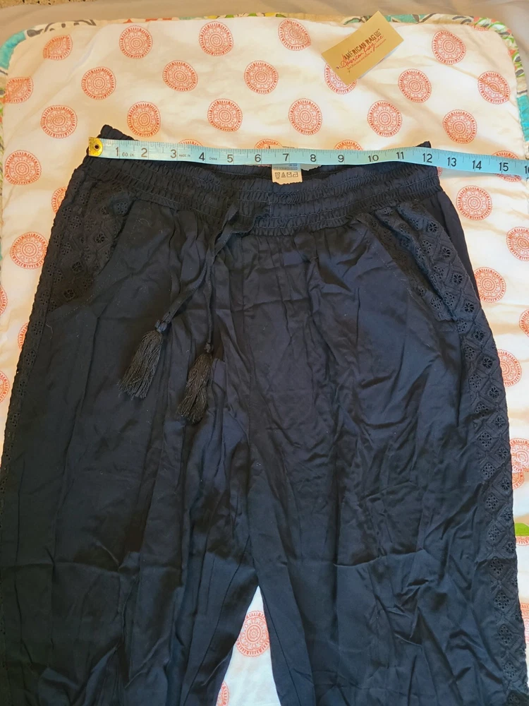 Elevate your casual wardrobe with these American Rag soft pants. Featuring an elastic waist and cuffs with crochet trim, front pockets and tasseled accents, these pants are perfect for travel, workwear, or everyday casual occasions. The high-rise pants have a straight leg style and are made of 100% rayon material, making them comfortable to wear in any season - winter, summer, fall, or spring. These black pants come in size S and have a pull-on closure with a drawstring. They have a flat front and are machine washable. Ideal for women who want to look stylish and comfortable, these pants are a great addition to any wardrobe. See photos for measurements approximate. NWT. Retail value $44.00. Soft, comfortable, and classy!