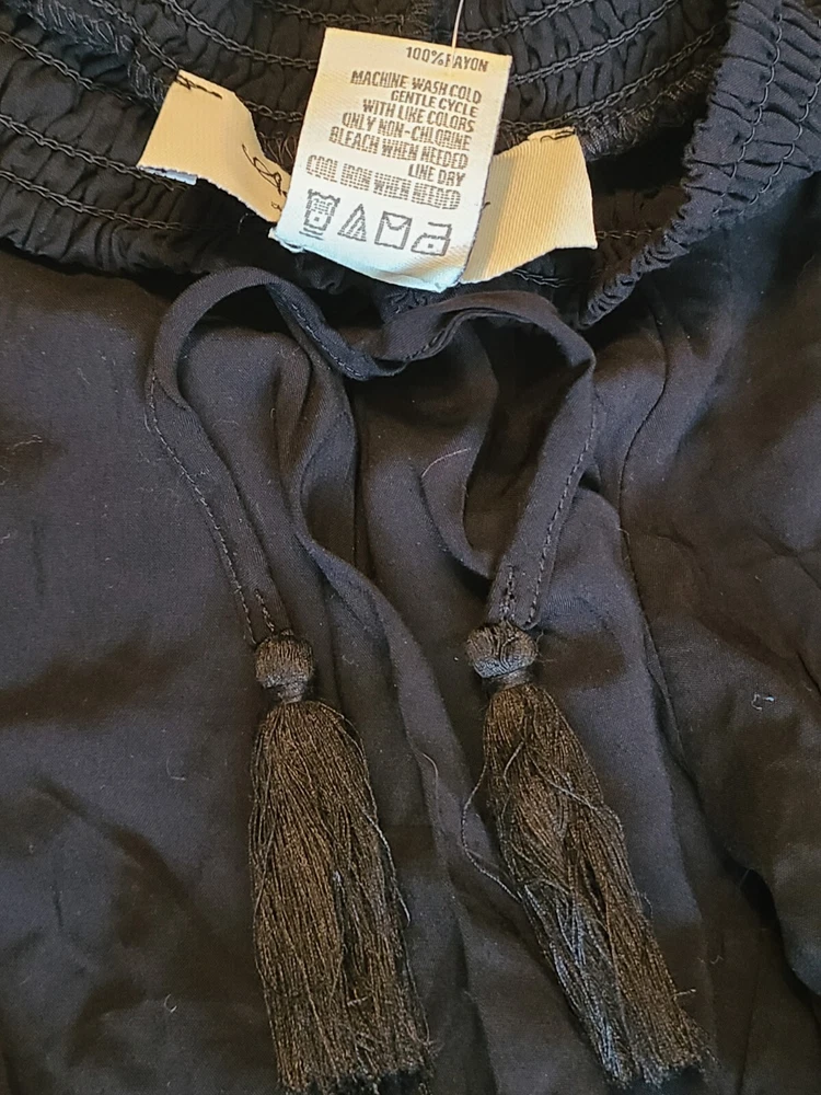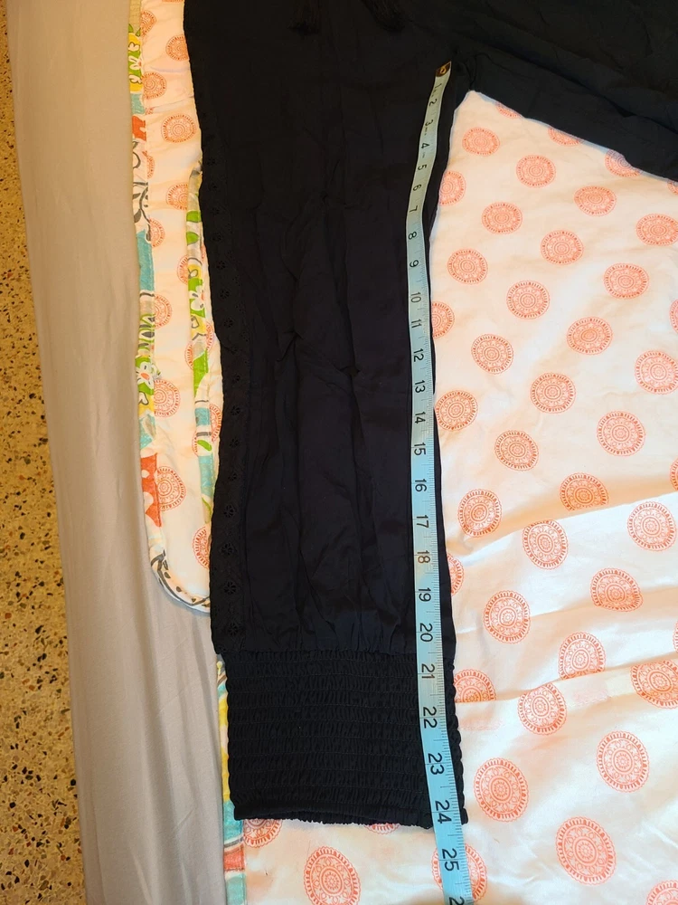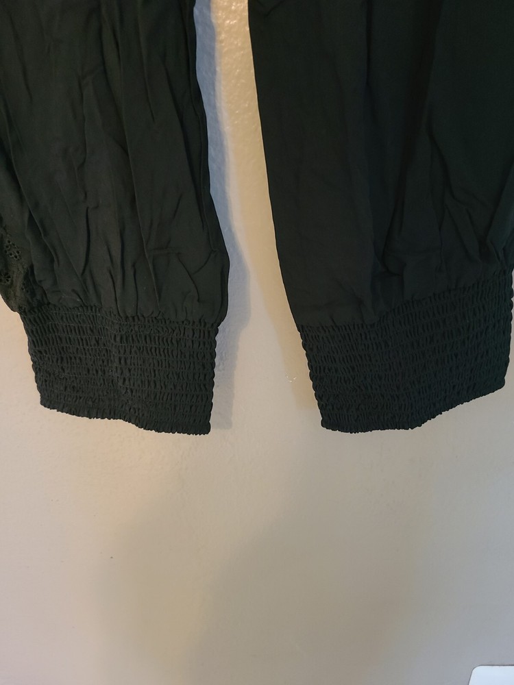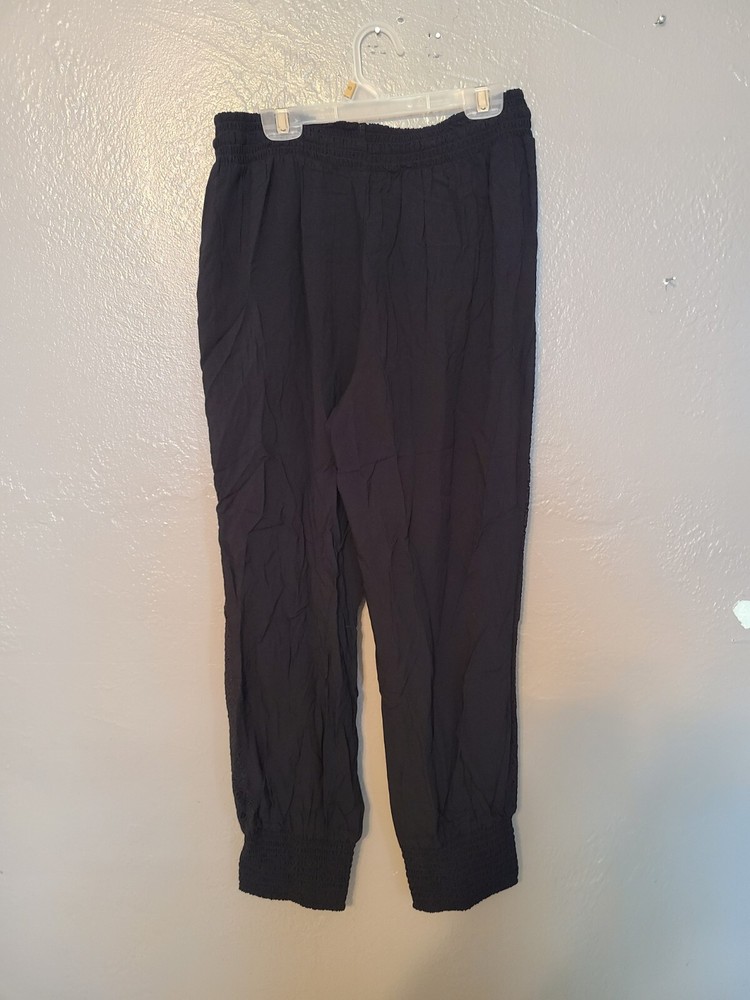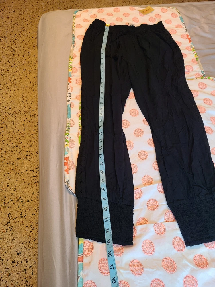 Elevate your casual wardrobe with these American Rag soft pants. Featuring an elastic waist and cuffs with crochet trim, front pockets and tasseled accents, these pants are perfect for travel, workwear, or everyday casual occasions. The high-rise pants have a straight leg style and are made of 100% rayon material, making them comfortable to wear in any season - winter, summer, fall, or spring. These black pants come in size S and have a pull-on closure with a drawstring. They have a flat front and are machine washable. Ideal for women who want to look stylish and comfortable, these pants are a great addition to any wardrobe. See photos for measurements approximate. NWT. Retail value $44.00. Soft, comfortable, and classy!