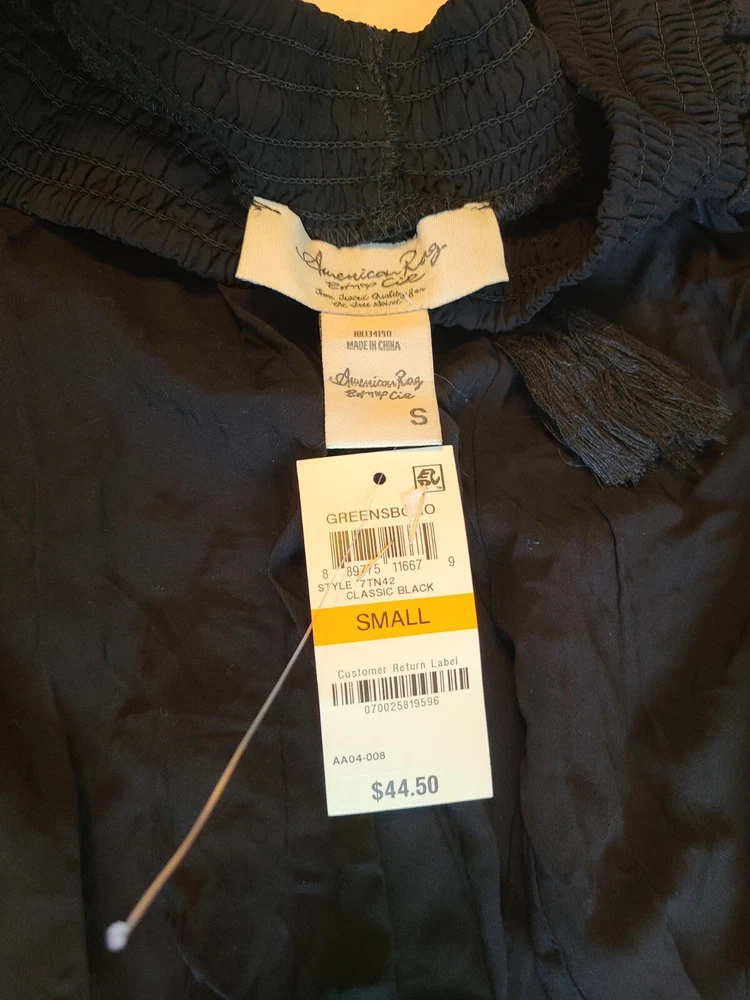 Front Type: Flat Front gtin13: 889775116679 Brand: American Rag Theme: casual Occasion: Casual, Travel, Workwear Model: American Rag Inseam: see photos Garment Care: Machine Washable Pattern: Solid Material: 100% Rayon Size: S Type: Pants Department: Women Season: Fall, Spring, Summer, Winter Rise: High (Greater than 10.5 in) Features: Elastic Waist UPC: 889775116679 Waist Size: see photos Accents: Crochet, Tasseled Size Type: Regular Vintage: No Color: Black Closure: Pull On, Drawstring Style: Jogger Country of Origin: China Personalize: No Fit: Regular Handmade: No Leg Style: Straight