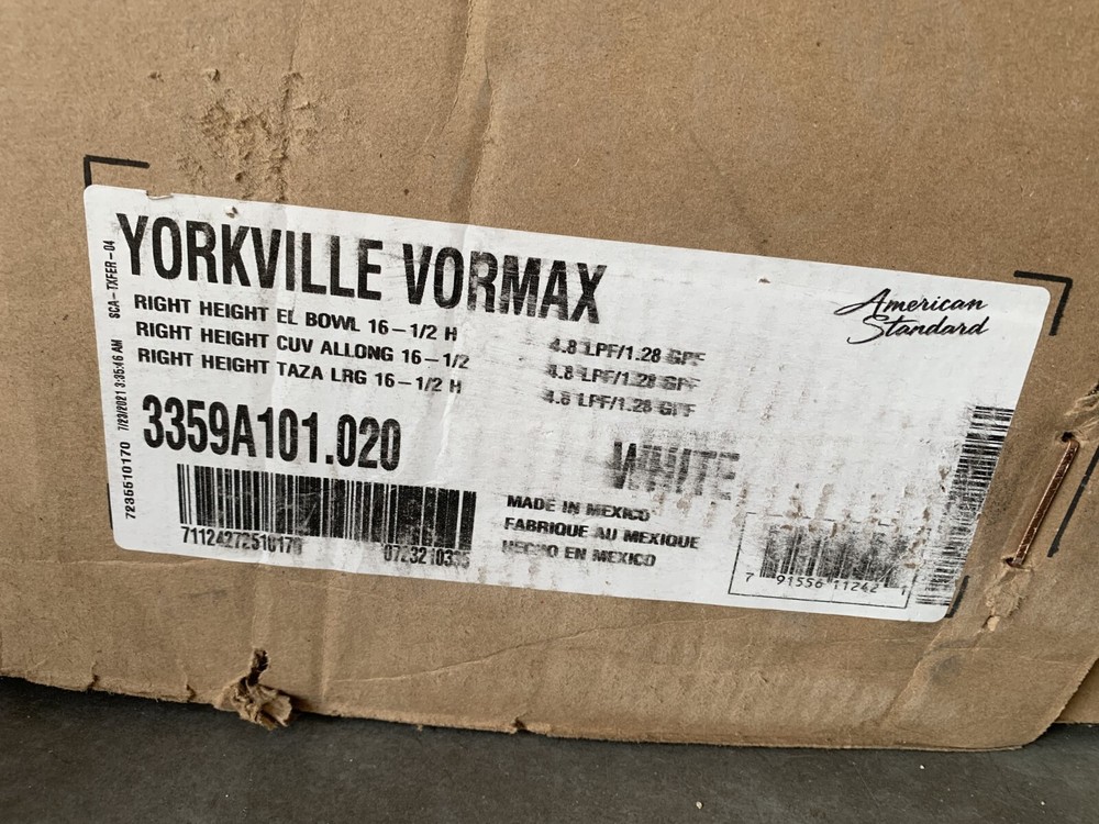 This is a NEW - unused American Standard 3359A101.020 Yorkville Vormax Elongated Toilet Bowl 1.28 GPF Buyers and Re-sellers, don't miss this opportunity to purchase quality surplus equipment at a great price! There are many more surplus parts on our store, check it out! Return Policy: Returns are accepted within 60 days of the delivery date. Rest assured we will cover all return shipping costs! All returns must be in "as shipped" original condition to qualify for a refund. Photos of packing and product is required for damaged items. Customer returns that satisfy all of the above requirements will be issued a refund including any applicable sales tax American Standard 3359A101.020 Yorkville Vormax Elongated Toilet Bowl 1.28 GPF